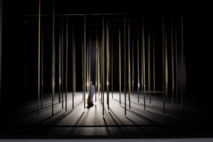 ZM : Dès que le travail sur le livret a commencé, j'ai vu la scénographie et l'ai réalisée en même temps que naissait la musique. J'ai imaginé, dans un premier temps, un ensemble de lames placées au-dessus des têtes, comme des épées de Damoclès, qui vont par étapes descendre pour devenir des barreaux et enfermer les personnages ; grâce aux jeux de lumière, le sol se peuple d'ombres et de traces de toutes espèces. Lorsque Eurydice bascule dans la folie, l'espace se libère de ces barreaux, ne laissant que la cage où est retenu Créon. Au retour d'Hémon, le plateau est totalement vide, tout baigne dans la blancheur d'une lumière intense. On est dans un espace épuré, presque mental ; mais subsistent les ombres et les traces qui restent au sol.