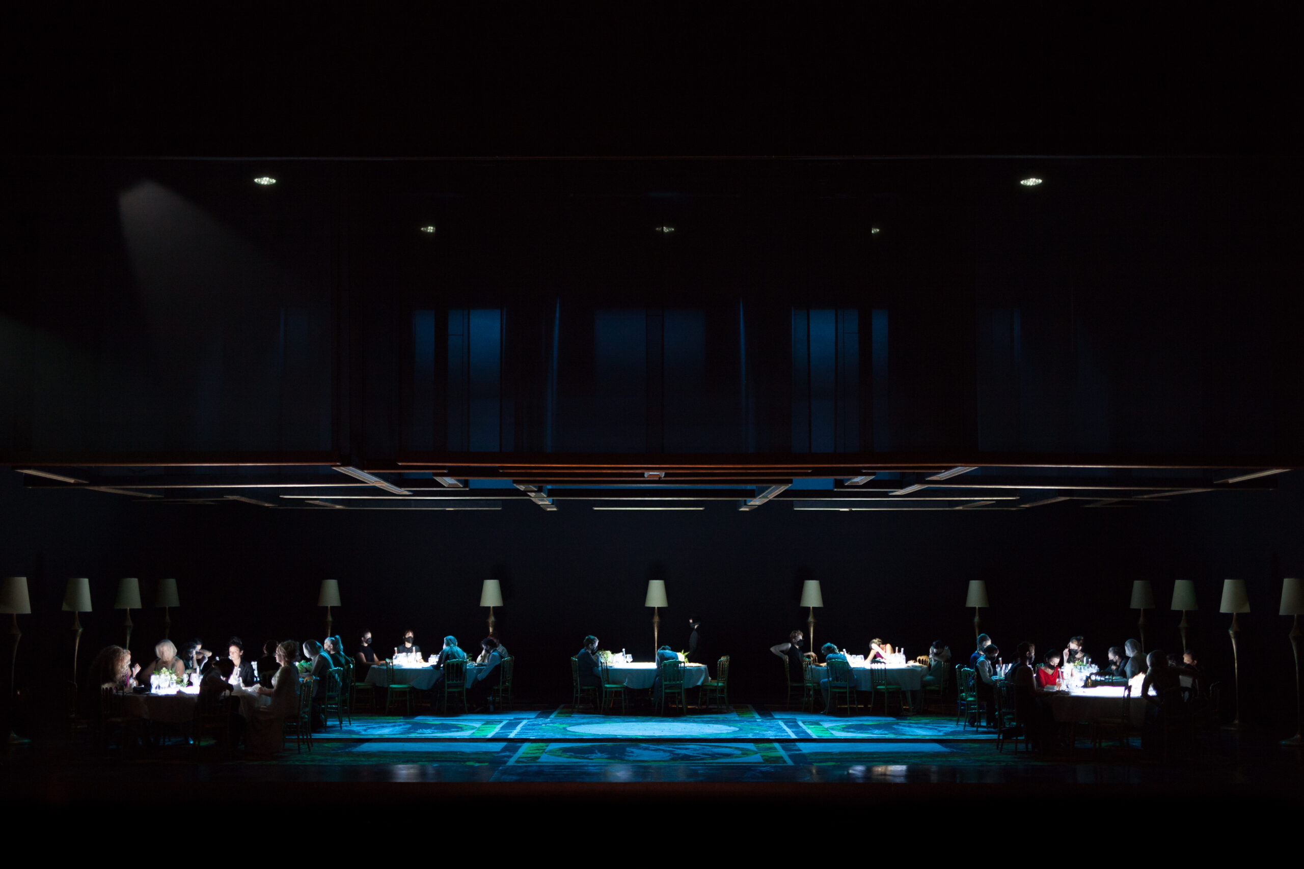 Au départ, Ollé séduit et intrigue. Un prologue cinématographique (procédé qui avait réussi à sa belle Alceste de 2017) nous attache d'emblée aux deux rôles-titres : visiblement ces deux-là, fraîchement mariés, s'adorent, à peine distraits de leur attraction réciproque par le jet d'œuf pourri sur la vitre arrière de la voiture qui les conduit au château. Un miroir horizontal, découpé dans un tulle d'avant-scène permettra de se refaire une beauté face public. Derrière, dans une pénombre savamment tamisée, un labyrinthe de tulles édifie progressivement un château-prison dont les murs s'élèvent et s'abaissent à l'envi. Ensuite le labyrinthe gagne les cintres. Ses fondations dessinent alors les contours d'un plafond surmontant le parquet marqueté d'une luxueuse salle de banquet. L'Acte II accuse peu à peu un certain fléchissement d'inspiration : on assiste à la scolaire édification d'une pyramide constituée des tables de la noce, du sommet de laquelle Ariane et la Nourrice exhortent les captives à la rébellion. On tombe poliment escarpins et bijoux alors que l'on attendait un jusqu'au boutisme à la Femen. L'Acte III entérine le decrescendo : le labyrinthique plafond, qui a cessé tout mouvement, est condamné à contempler longuement un chœur féminin jouant les utilités dans l'ombre. La conclusion voit les femmes « libérées » faire effectuer une simple volte-face à leur bourreau ensanglanté, vissé sur sa chaise, pour un regard public censé donner à penser. Une image bien inoffensive en regard de celle du Barbe-Bleue d'Olivier Py, nu et cornu, brisé sur sa chaise, d'une force symbolique autrement fascinante.