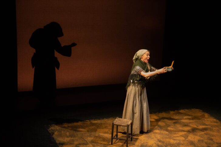 L'opérette fantastique de Jacques Offenbach écrite en 1857 est « un petit Faust » comme on le dit de L'Histoire du soldat de Stravinsky auquel il est fait directement allusion, à plusieurs reprises et au gré de citations (des clins d'œil du transcripteur sans aucun doute…). Georges, le bon petit soldat, a lui aussi un violon – Odile Heimburger rayonnante, qui joue et chante sur scène ! C'est d'ailleurs lui (et la Vierge) qui sauveront Jeanne de l'emprise du diable. Le rouet, seul élément de décor sur le plateau, devant lequel Jeanne chante un premier air bien scandé, évoque Marguerite. D'autres références faustiennes se lisent dans l'ouvrage. Le personnage de Gaspard est le faux ami, qui a pactisé avec le diable comme le Kaspar du Freischütz (1821) de Carl Maria von Weber. Sa grande scène avec Jeanne, dont il n'obtiendra que deux « Je t'aime » est l'acmé de l'ouvrage, la magie des lumières aidant. Aisance scénique et voix vaillante du baryton Antoine Philippot qui parvient à ensorceler sa victime le temps d'une valse. La soprano chante alors son « air des bijoux » (deux ans avant celui de Gounod) : la voix est agile et les aigus fort jolis. Le ténor léger Benoît Rameau incarne quant à lui un mari falot et incrédule. Son duo avec Gaspard (« Le Jurançon est sur la table »), devant la taverne où il sera retenu, est son plus bel air de bravoure.