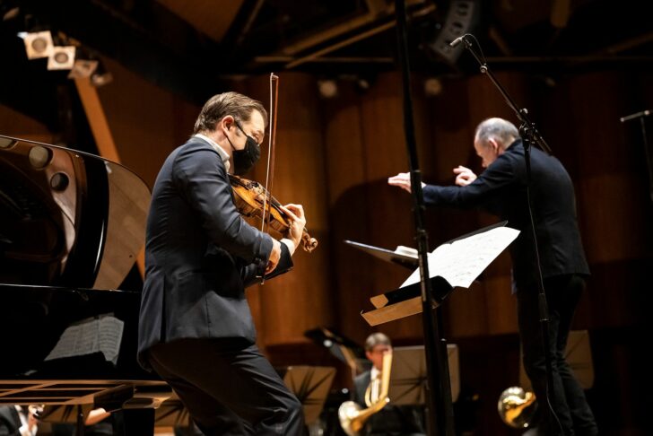Sur le plateau, Bertrand Chamayou et Renaud Capuçon en solistes au côté des vents de l'orchestre Les Siècles jouent à cette occasion sur des instruments d'époque de facture allemande. L'élan bergien est à l'œuvre dans ce concerto de conception très originale réclamant une écoute active tant l'écriture est dense et le propos toujours renouvelé. Le premier mouvement (Thema scherzoso con variazioni), dévolu au piano, est magnifiquement conduit, où le jeu puissant et énergétique de Chamayou entre en synergie avec les vents. L'acoustique semble moins favorable au violon de Renaud Capuçon dont la patine romantique et le jeu un peu lisse dans le médium de son registre le mettent trop en retrait dans un Adagio où dominent les sonorités charnues des vents. S'immisçant par fondu enchaîné, le piano déferle à nouveau et réamorce l'élan d'un Rondo ritmico con Introduzione foisonnant, avec ses trois tempos, ses trois rythmes et ses trois « personnages sonores ». La virtuosité engagée au sein des vents est extrême dont nos treize musiciens relèvent vaillamment le défi. Les deux solistes réunis doivent lutter pour s'imposer dans cet étourdissant maelström sonore que Berg mène jusqu'à un point de rupture. L'épilogue est abrupt, bien anticipé par François-Xavier Roth qui en souligne le saisissement.