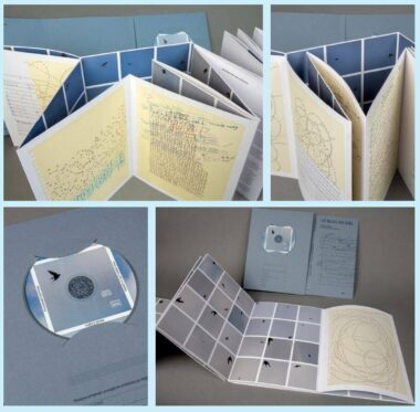 Très bel objet présenté dans sa jaquette de carton bleu, le livre se déploie en accordéon (un « Leporello »), dévoilant sur une face les images autour du vol de l'hirondelle d'Edouard Taufenbach, sur l'autre ses dessins avec volutes et petites flèches qui contrepointent la notation musicale des partitions de Régis Campo, l'envahissent et fusionnent parfois avec elle. Le vol de l'hirondelle s'origine dans les souvenirs d'enfance du photographe et s'attache aux notions de rythme, de mouvement et de variation, autant de dimensions rejoignant l'univers musical. Essentiellement mouvant, le flux des images s'accompagne d'une progression des couleurs du ciel, de l'aube à midi dans les airs pourrait-on dire, pour paraphraser le maître du mouvement qu'était Debussy.