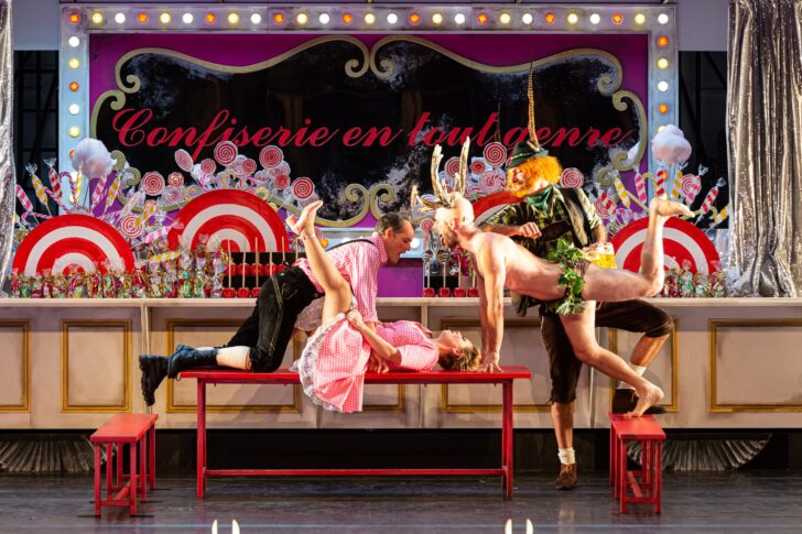 Et même une fête foraine. Celle de certaine enfance vosgienne : Pierre-André Weitz, avant de devenir l'impressionnant alter ego scénique d'Olivier Py, fut l'enfant impressionné par les étincelles électriques des « autos tamponnantes », les stands de tirs, les pommes d'amour… qu'il attendait des mois durant. « Les roulottes multicolores arrivaient en même temps que la première neige… », confie-t'il avant de laisser aux mesures introductives de L'Oeil crevé (titre habituel de l'originel V'lan dans l'œil) le soin de ressusciter poétiquement, dans le lointain, par-delà les fûts d'une obscure forêt de sapins, la très allénienne Wonder Wheel de cet univers lumineux. Un travelling avant conduit ensuite l'œil à se poser face au décor transformiste d'un imposant poids-lourd forain : côté pile palais confiseur enchanté, côté face stand de tir, puis tunnel-donjon de l'horreur.