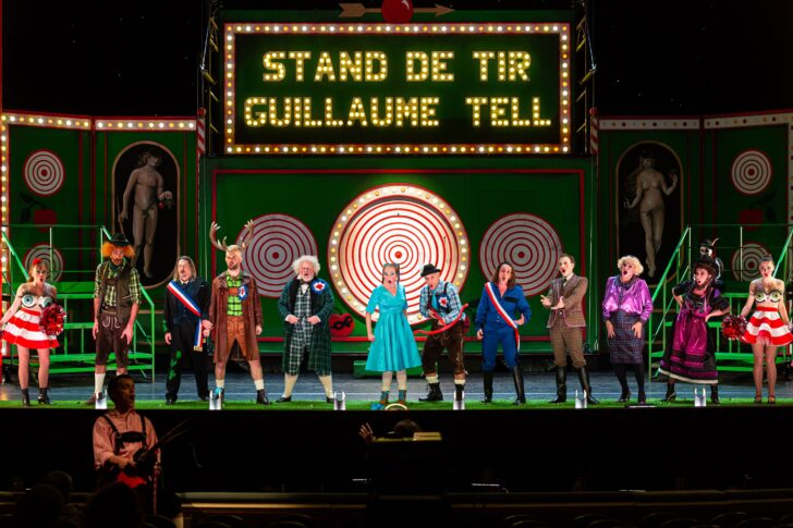 C'est dans cet univers émerveillant, dédié au thème de la Pomme (celle d'Amour, celle de Guillaume Tell, celle de l'Adam et Eve de Dürer), niché dans un écrin d'ampoules de scène et d'étoiles, dessiné avec le soin esthétique qu'on lui connaît, que Pierre-André Weitz ressuscite les trois actes de V'lan dans l'oeil, le deuxième opéra-bouffe (créé en 1867 au Théâtre des Folies-Dramatiques) de l'inventeur de l'opérette : Hervé. Le « compositeur toqué » (sobriquet de Louis-Auguste-Florimond) est l'auteur de la musique, aussi habile (le Duo Dindonnette/Alexandrivore du I, La Légende de la langouste atmosphérique, la berliozienne – textuellement parlant – villanelle de la Polonaise et de l'hirondelle, le Finale du II, l'émouvant Air yodelé d'Alexandrivore, les Ripitipata, pitipata, patère de Fleur-de-Noblesse) que celle de son rival et néanmoins ami Offenbach, et des paroles (« Madame, voulez-vous vous asseoir ? – Non merci, je n'ai pas soif ! » ou « Je vais jouter. Je n'ajoute rien ») d'un scénario effectivement complètement « toqué » : le livret tambouille aristocratie et roture, tir à l'arc et secrets de familles (avec résolutions en chaîne façon Noces de Figaro), love stories (princesse-menuisière et benêt de village / marquise et gendarme…) et œil crevé ! Deux heures quinze de manigances diverses, habitées par une Mort joueuse (un ectoplasme dansant, un squelette jouant à la poupée) et une jolie morale à la clé : beaucoup de gens se mettent le doigt dans l'œil avec les conséquences que l'on sait…