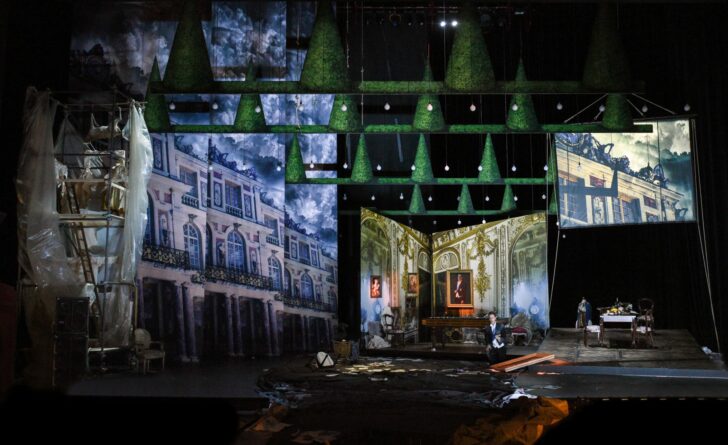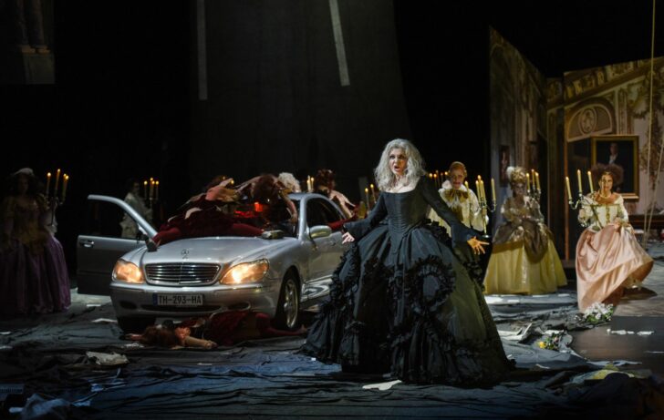Scénographie de type bric-à-brac (jetés pêle-mêle sur le plateau les lambris d'un salon, la façade d'un palais bien connu, des alignements sylvestres, un carrosse bringuebalant, un tablier d'autoroute tombant des cintres sur lequel le héros éponyme trouvera la mort au volant d'une Mercedes), chorégraphie en miettes (Pascale-Sabine Chevroton convie le chœur à sonner l'hallali des codes dansés d'un monde en voie de disparition). De cette société en lambeaux (on aperçoit même, dans le décor, une maquette du… décor) émerge la hargne d'une Aricie en blouson de cuir grimaçant d'emblée à l'adresse de Louis emperruqué. Le ton de la rébellion est donné. Le propos est intéressant, mais sa réalisation inégale et chargée. Lorenzo Fioroni n'en est pourtant pas à son coup d'essai, ce qu'on aurait volontiers parié avant d'apprendre qu'une décennie déjà écoulée lui a pourtant fait faire de belles rencontres : Don Giovanni, Turandot, Onéguine…