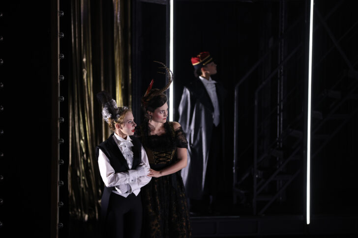 Le décor du premier acte nous propose un intérieur viennois avec une collection de cadres qui se révèlent autant d'alvéoles pour l'apparition des personnages. Il s'en suit des jeux à distance assez divertissants. Le procédé pourrait s'avérer répétitif mais la mise en place est impeccable, la gestuelle soignée et l'inventivité permanente. On apprécie les trouvailles spirituelles mais aussi la référence au cinéma muet dans la scène entre Alfred et Rosalinde. Le décor s'entrouvre ensuite pour la fête chez Orlofsky avec un grand escalier tapissé de rouge et des choristes masqués, sans baisse de rythme dans la régie d'un spectacle minutieusement réglé et toujours divertissant. Le soin apporté aux costumes et aux lumières ajoute à notre plaisir pour une représentation qui est une pleine réussite.