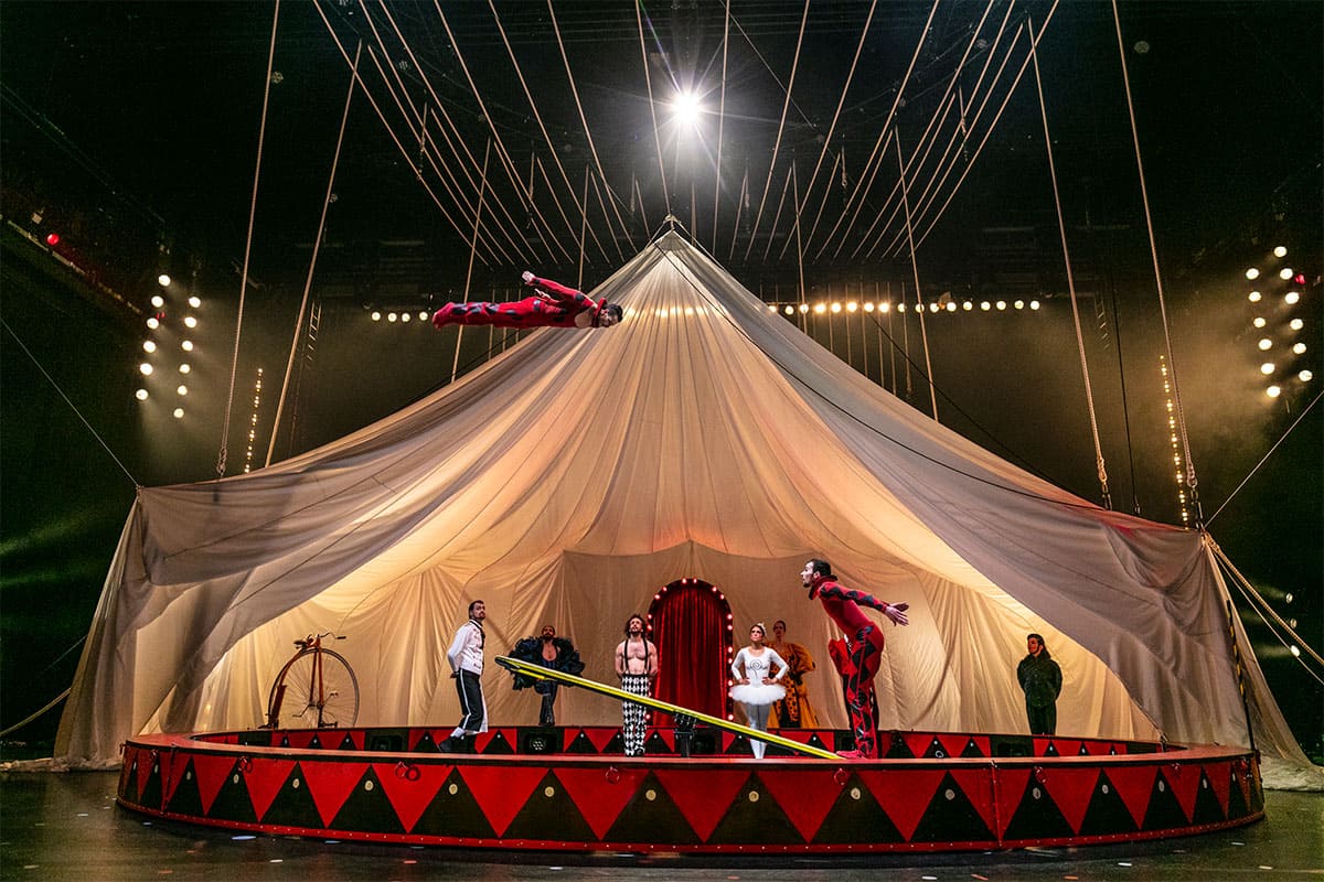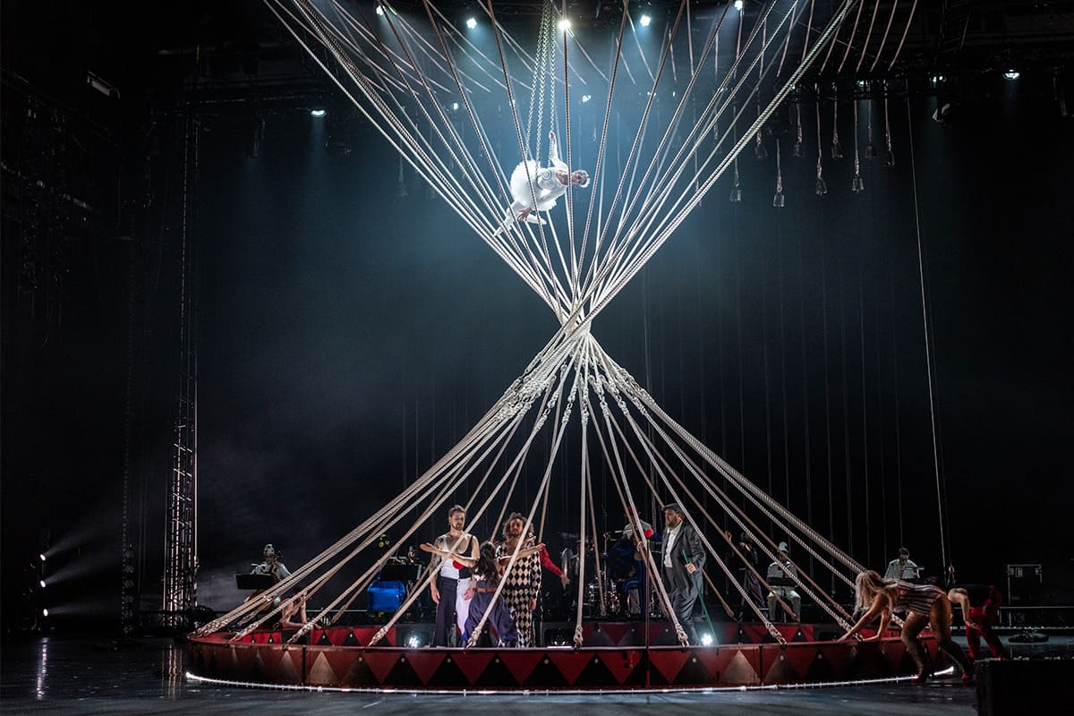 Autour de cette assise poétique et philosophique d'un minimalisme quasi-naïf, le librettiste David Henry Hwang pour sa quatrième collaboration avec Philip Glass ( 1000 Airplanes on the roof, The Voyage, The Sound of a Voice) a élaboré, avec Tilde Bjöfors, une trame qui ramène à la surface de la mémoire les souvenirs du poète consécutifs à sa rencontre, en 1949, avec le cirque de la famille Cristiani, dont il partagea un temps le répétitif quotidien : entraînement, montage du chapiteau, performance. L'on songe dès le début aux visions du regretté Cirque Plume, autre cirque sans animaux mais avec compositeur attitré (Robert Miny) où tout était musique, poésie, humour, où tout tournait, comme ici, autour de l'humain. Un quotidien adonné au mouvement perpétuel, que la mise en scène de Tilde Bjöfors, accordé aux mots simplissimes du poète, donne à voir en convoquant tous les trucs de son art : de vaporeux voilages séduisent d'emblée, qui dessinent les contours d'un chapiteau dont on soulève les tentures, une arène tournoyant sur une spirale galactique devenant ensuite couronne de lumière dans les airs, d'inextricables entrelacs de cordages. Acrobates, trapézistes, femme à barbe, clowns, jongleurs, funambules, maître de cérémonie, gréeurs de chapiteau… ils sont tous là, laterna magica d'un Lax à l'enthousiasme mémoriel intact. Le jeu d'orgues est à fond. Jonglages virtuoses et vertigineuses envolées trapézistes calés sur la musique, voient leur intérêt magnifié par la hauteur de l'inspiration glassienne, bien éloignée, on s'en doute du clinquant de certaines partitions circassiennes de jadis. C'est donc avec une âme d'enfant retrouvée que l'on reçoit la grâce effective de ce spectacle total et troublant, puisque la troupe et la musique (aux lignes prudentes en terme d'ambitus) entretiennent la plus malicieuse des confusions entre ceux qui sont d'authentiques chanteurs d'opéras (outre le rôle principal, Karolina Blixt, Lars Johansson Brissman, Susanna Stern) et les autres.
