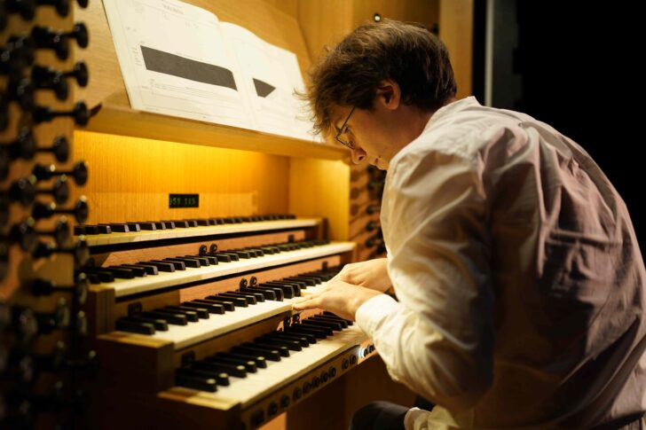 Passés les saluts, la lumière se tamise, dans un bleu fluo d'où ne ressort que le carré jaune dédié à Karol Mossakowski. Déjà très impressionnant lors de ses dernières prestations dans cette salle, le jeune organiste attaque avec une incroyable énergie un peu forcée l' ouvrage de Ligeti Volumina, abordée ici dans sa dernière version, la plus complète, notamment par les sons à jouer avec les pédales de l'orgue.