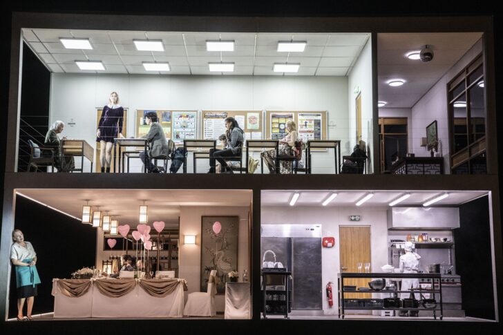 Simon Stone, qui déclare vouloir donner aux mythes des allures contemporaines (son actuel Tristan aixois en est la démonstration passionnante) et aux drames contemporains des atours mythiques, n'y va pas pas quatre chemins pour marquer les esprits. Avec Chloe Lamford, il a opté pour le brillant dispositif d'un immense décor multi-pièces sur deux étages. Déjà en mouvement au lever de rideau, c'est un manège infernal aux pouvoirs de machine à remonter le Temps. Cette implacable machinerie arpente en tous sens la chronologie temporelle et révèle en les modifiant imperceptiblement à chaque fois, les pièces (hall, salle de mariage, de classe, cuisine, placard, toilettes…) des deux drames joués ou rejoués sous nos yeux. Une prouesse technique (les machinistes seront longuement fêtés au terme de la performance) qui n'en est pas qu'une, puisque son but est de donner littéralement à voir comment le passé peut gangrener le présent : peu à peu celui-ci (le mariage) se voit phagocyté par celui-là (le lycée). À la fin, le lycée international et ses pièces désertées griffées de sang a complètement dévoré la salle de convivialité qui à son tour n'est plus qu'un souvenir. Abaissant progressivement toutes ses cartes, ce spectacle-choc laisse sonné.