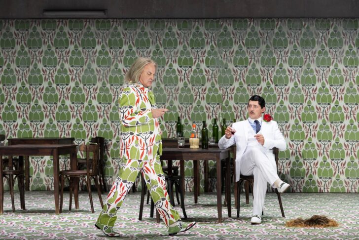 Cette ligne dramaturgique, parfaitement tenue, est le point fort d'un spectacle qui a élu domicile dans le décor unique et signifiant (une constante chez Kosky) d'une sorte de « cafétéria du monde » (le metteur en scène pose au passage un regard ému sur les « petites gens » qui fréquentent cette Auberge de la Jarretière sans âge) dont le carrelage à l'ancienne aura le pouvoir de déteindre sur la tenue de ce héros à l'énergie débordante. Probablement un des plus basiques de Kosky, ce très spartiate environnement – dont seul un tiers du mur du fond changera le papier peint – meublé de quelques tables et de figurants défraîchis, invitera chez les Ford un « lit pâtissier » à la convivialité kitsch, avant de se vider totalement à Windsor. La direction d'acteurs (une fois encore la marque de fabrique de Kosky) est réglée au millimètre. Le metteur en scène, aussi discursif, aussi pressé que la partition au contraignant quasi-durchkomponiert, plaque l'oreille du spectateur sur la moindre pépite orchestrale, ambitionnant même de lui greffer plusieurs paires d'yeux œil lors de la mécanique horlogère des scènes d'ensemble. Cette démarche sans temps mort culmine dans la nudité d'un dernier tableau dont le spectaculaire repose entièrement sur la subtilité d'un jeu d'orgues crépusculaire et l'utilisation détournée de masques sanitaires barbouillés pour le chœur. La fugue finale (« Le Monde est une farce ») se conclut par l'obscurité tombant comme un couperet sur l'apesanteur saisissante d'un bond général vers les cintres.