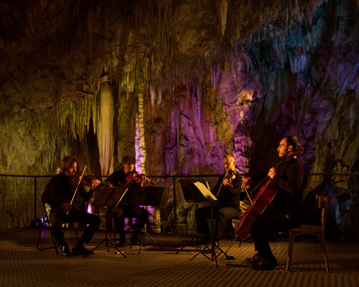 Comme la plupart des musiciens invités dans cette édition 2021, le Quatuor Béla n'avait jamais encore foulé le sol du festival et moins encore celui des Grottes de Canalettes qui accueillent la manifestation depuis plusieurs années. Une scène a été aménagée dans l'un des décors les plus grandioses du site. L'humidité du lieu n'est pas sans inquiéter nos musiciens, non pas tant pour l'accord des instruments que pour l'état de la mèche des archets… Aux cordes des Béla s'associe la voix de la soprano française Julia Wischniewski dans un programme un rien éclectique (Britten et Mozart) incluant une création du compositeur en résidence, le Colombien Daniel Arango-Prada.