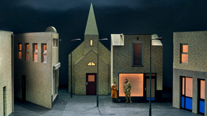 De Wagner, Tcherniakov ne garde que la musique et réinvente le livret : plus de vaisseau, plus de fantôme et plus de Wagner ! Le Hollandais en chef de gang retourne dans son village pour se venger ; la rencontre avec Daland se fait autour d'une table dans un bistrot ; Mary et Daland, en couple, jouent les utilités lors d'un repas dans leur coquette maison afin que Senta rencontre le Hollandais ; il la séduit pour mieux la rejeter ensuite, c'est le début de la vengeance ; dans une rixe avec les habitants du village, le Hollandais tire sur la foule, faisant plusieurs morts parmi celle-ci, avant de mettre finalement le feu au village, ultime épisode de la vengeance ! Mais, dans ce scénario catastrophe, que faire de la célèbre Ballade de Senta ? Tcherniakov résout ce douloureux problème (n'est pas Wagner qui veut !) par un insensé tour de passe-passe en faisant chanter Senta devant un vieux portrait dont on ne sait trop qui, tiré du panier de Mary ? S'agit-il d'un portrait du Hollandais plus jeune témoignant d'une ancienne liaison entre lui et Mary, liaison dont Senta pourrait être le fruit, expliquant par-là l'incroyable fin ? On frémit devant tant d'incohérences et d'inventions d'autant que le metteur en scène n'a pas fini de nous étonner en modifiant le dénouement final : plus de suicide sacrificiel de Senta mais un assassinat du Hollandais sous les coups de fusil de Mary (qui voudrait dans cette vision ubuesque protéger sa supposée fille ?), avant que le rideau ne tombe, laissant Senta bien vivante, dans cette pitoyable réécriture. Quelques arguments sont, toutefois à apporter pour la défense de Tcherniakov : une scénographie assez réussie représentant probablement une petite ville d'Allemagne du Nord aux maisons très stylisées et une direction d'acteurs parfaitement réglée occupant tout l'espace scénique. La seule référence à la mer se fait via les costumes type marin (bottes et cirés) dus à Elena Zaytseva.