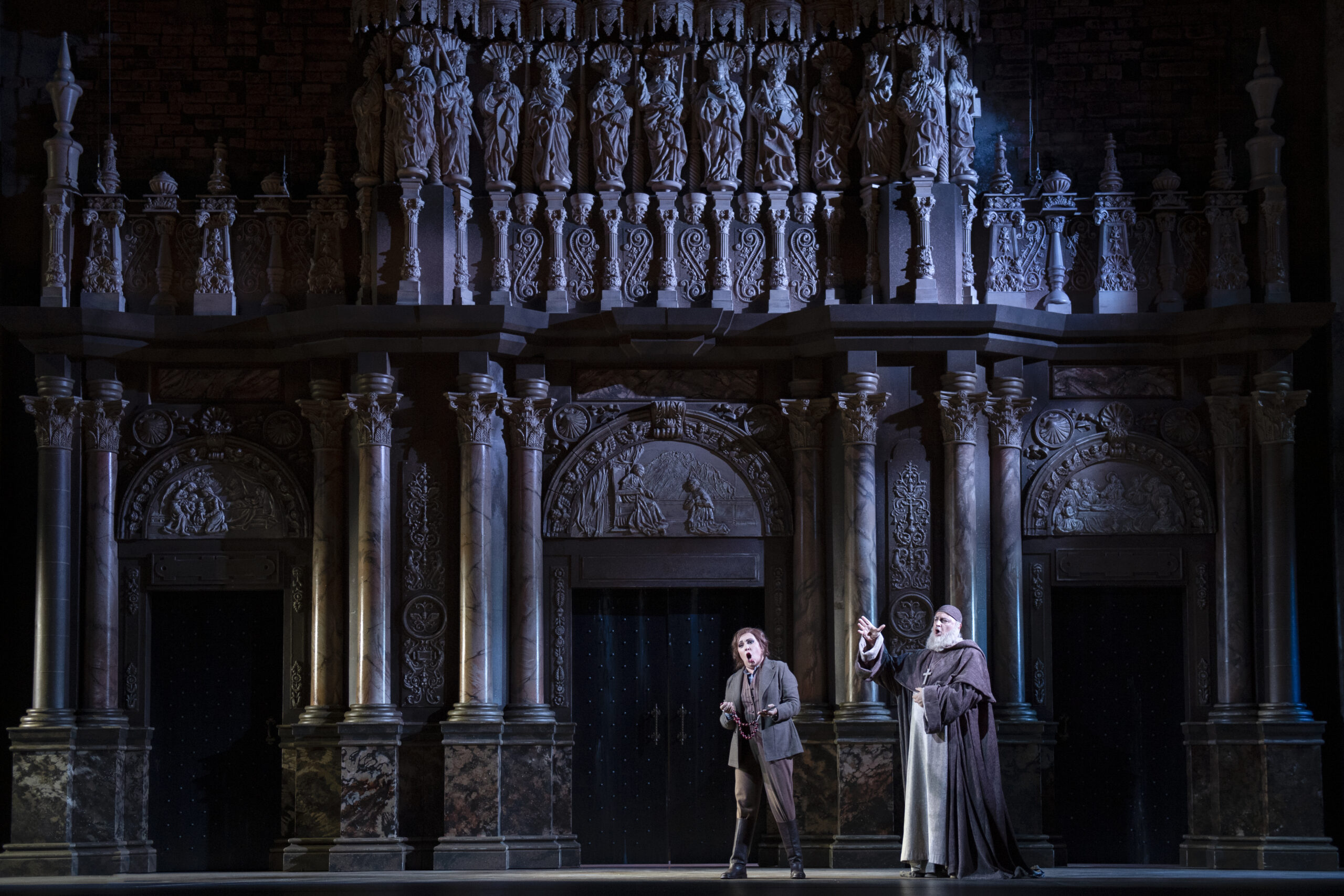 Mais pourquoi diantre, tout en « voulant ne pas rendre le travail des artistes ennuyeux et de ne pas le surcharger de mouvements inutiles et prétentieux » (Santucci dans son texte de présentation), imposer un quasi-statisme au fil des nombreux duos ou lors des scènes de foules ? Ces postures figées nous ramènent un peu à l'époque de l'opéra vu tel un « concert en costumes » (au demeurant fort beaux mais assez convenus de Fernand Ruiz) planté dans les superbes et historiés décors de Gary Mac Cann sous de somptueuses lumières d'Alex Brok. En dehors des quelques chorégraphies, très décalées et anecdotiques, l'immobilisme consensuel règne en maître.