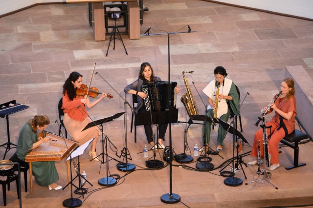 Strasbourgeois lui aussi et né en 2015, l'Ensemble Intercolor investit la Friedenskirche de Kehl, la ville allemande limitrophe où France Musique a posé ses micros. Intercolor est une réunion joyeuse de six filles jouant la musique des dames du passé comme celles d'aujourd'hui via une formation instrumentale atypique : violon ou alto, saxophones, clarinettes ou duduk, cymbalum, accordéon et électronique. Le mélange savant fonctionne à merveille dans les pièces au programme où voisinent Hildegarde von Bingen, Elisabeth Jacquet de la Guerre, Barbara Strozzi, Beatriz de Dia et Francesca Caccini. Le cymbalum officie comme un clavecin, le saxophone soprano évoque quelques cornet à bouquin ou hautbois d'amour, l'accordéon penche davantage vers les cordes pour en nourrir la texture ou assure le bourdon comme dans cet arrangement percussif autant qu'irrésistible de la chanson de la Caccini. À l'affiche également, une autre pièce de Clara Olivares, Fusion des fêlures, combinant à sa manière les couleurs de l'ensemble, entre finesse des textures, nervosité du geste et matière bruitée. La qualité de jeu au sein de l'ensemble est remarquable, alliant justesse des articulations et soin de l'équilibre sonore : autant d'atouts pour donner à d'autres compositeurs l'envie d'écrire pour cette jeune phalange en résidence cette année auprès de l'Ensemble Linea.