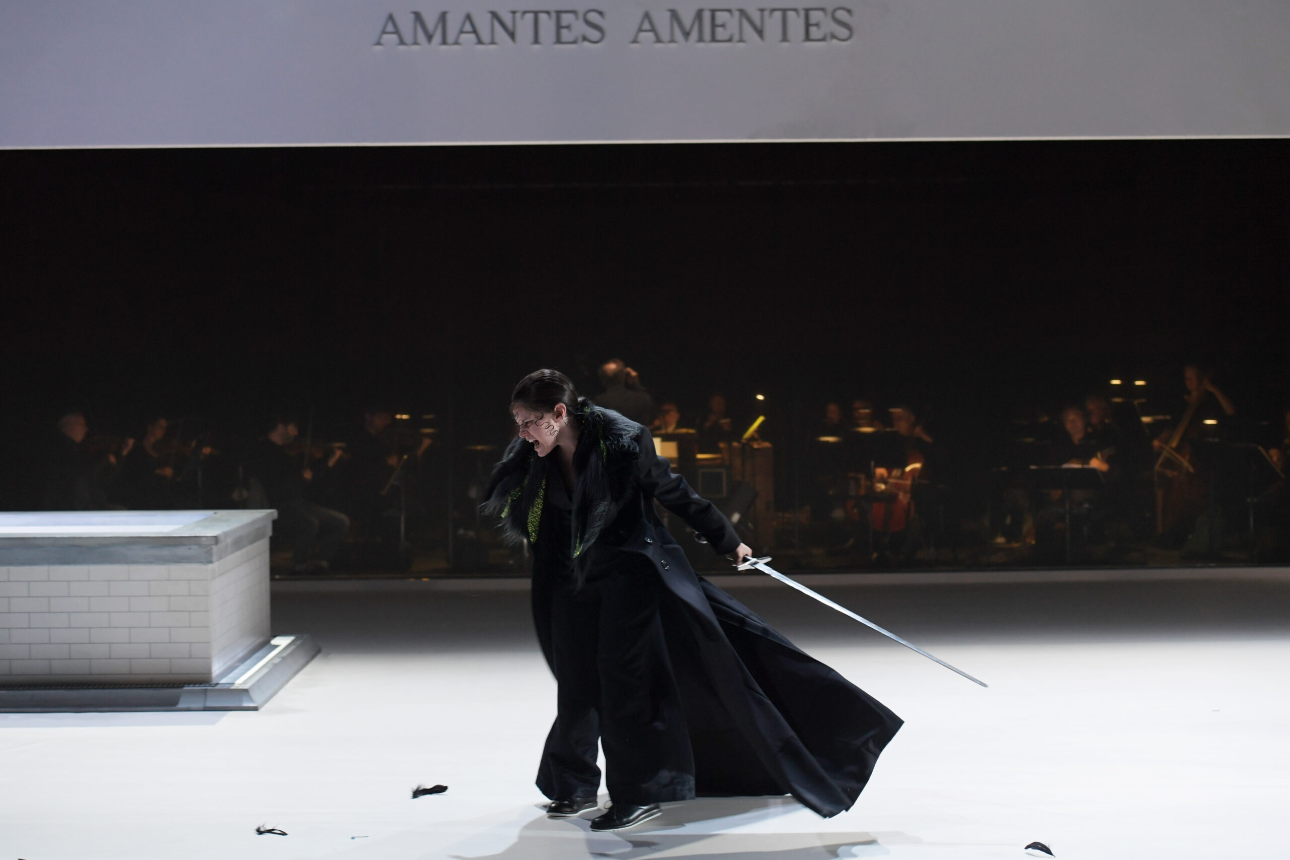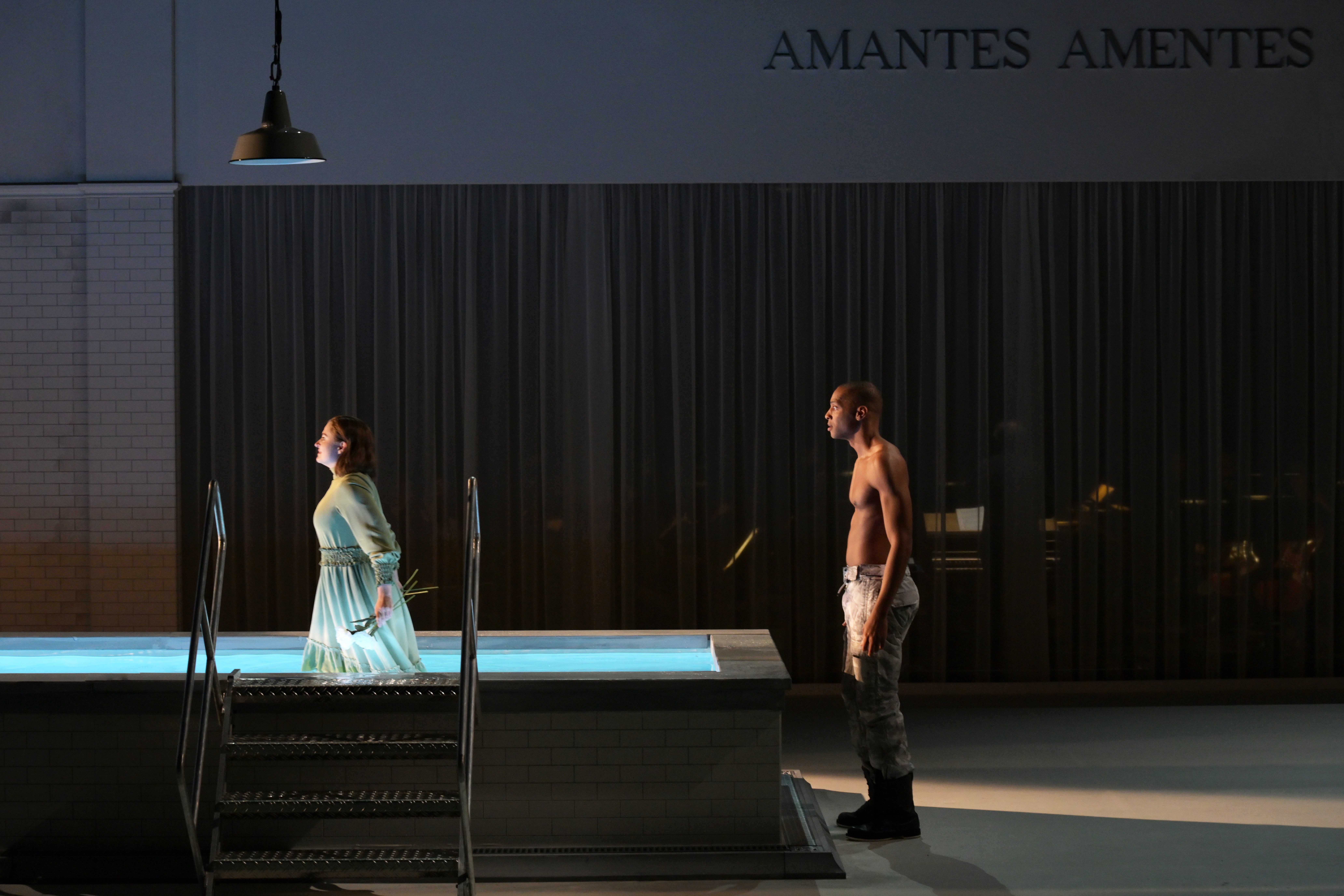 On peut compatir avec le metteur en scène Andrea Bernard, auquel le livret ne facilite pas la tâche : quatre personnages seulement, un manque certain de progression dramatique et un enjeu théâtral mal défini, le tout alors que la partition enchaîne des airs plus beaux les uns que les autres. Bernard a choisi de situer l'action dans un centre de cure thermale tenu par Melissa, la magicienne sans cœur (l'organe est dans un bocal soigneusement rangé dans une armoire avec les remèdes) ; le décor unique présente une vaste salle aux carreaux blancs, avec un bassin où Amadigi et Dardano font leurs ablutions. Le metteur en scène a d'abondantes explications pour ce choix dans le programme, mais ni elles, ni l'abondance de symboles avec lesquels il veut relancer le discours, ne parviennent à donner à la soirée la structure dont elle a grand besoin. La force émotionnelle des airs tombe alors un peu à plat, et on se surprend à se contenter d'en admirer la beauté comme dans un récital. Amantes amentes, les amants sont insensés, dit une expression empruntée à Térence sur le fond de scène : et alors ?