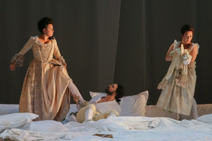 Don Giovanni agonise dans sa demeure en flammes et repasse les derniers instants de sa vie sur son lit de mort… Passé le rideau de feu du dramma des premiers accords de l'Ouverture, tout se déroule dans l'apparent giocoso de l'éblouissante blancheur des draps, dans une immense couche occupant la totalité du plateau. Un plateau sur le plateau, sis dans une vaste pièce dont l'architecture moulurée sera déstabilisée par de fascinants surlignages vidéographiques, et dont le mur du fond s'ouvrira, via quelques translations de rideau et de gracieux effets à l'iris, sur l'immensité de ciels d'été, de nuits d'orage, de paysages calcinés de soleil où paissent d'inquiétants bovidés. Le geste fort de ce décor signifiant excepté (le Don passe l'essentiel de son emploi du temps dans ce lit multi-fonctions aux allures de tour de guet, qui accueille les vivants et les morts), l'élégant classicisme de magnifiques costumes XVIIIe caresse les puristes dans le sens du poil. Daniel Benoin connaît bien le héros de Mozart, que l'homme de théâtre qu'il est a beaucoup fréquenté chez Molière. Malgré la relative sous-utilisation faite finalement de ce lit-tombe-table et de sa literie aux possibilités pourtant infinies, malgré les limites d'une direction d'acteurs parfois répétitive (les déshabillages), chacun trouvera belle matière à moudre dans les propositions assumées d'une conception assez poussée : la référence à Sade dès la modulation en mineur de l'Air du Catalogue, l'énigmatique omniprésence d'un pianofortiste en noir (Iákovos Pappás) dans une alcôve à cour, la crudité sans voile, la soufflante conclusion, dans cette chambre d'Eros devenue crematorium de Thanatos, de l'assassinat concerté du monstre au moyen d'un coup de poignard bien placé par chacune des victimes dont les costumes progressivement ripolinés du blanc au noir affichent in fine l'égale part d'ombre.