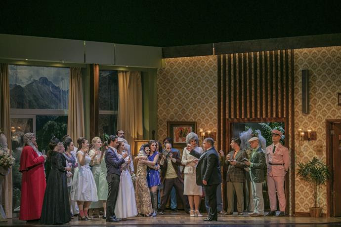 Malgré le contexte et contre toute attente, il serait vain de vouloir chercher dans la mise en scène une quelconque composante socio-politique (à laquelle l'opéra de Mozart se prête pourtant comme un gant). préfère ici s'en tenir, avec un bonheur certain, à une vision purement burlesque fidèle à l'opéra buffa dans une transposition temporelle des années 60. La scénographie très étirée comprend huit pièces en enfilade figurant le palais du Comte Almaviva, aux décors (Yannis Katranitsas) d'un kitsch assumé, renforcé par les costumes idoines de Ioanna Tsami. Cette organisation du plateau en plusieurs lieux vus simultanément offre au spectateur une plus grande lisibilité du texte, de la dramaturgie et de la composante psychologique des différents personnages. Ainsi découvre-t-on une comtesse boulimique, un comte « sex addict », un musicien paumé qui erre dans les multiples décors en jouant des récitatifs très remaniés aux accents jazzy, et un frigo où s'entassent nombre de personnages… Tout cela est bel et bon, concourant à la farce elle même entretenue par un jeu d'acteurs irréprochable.