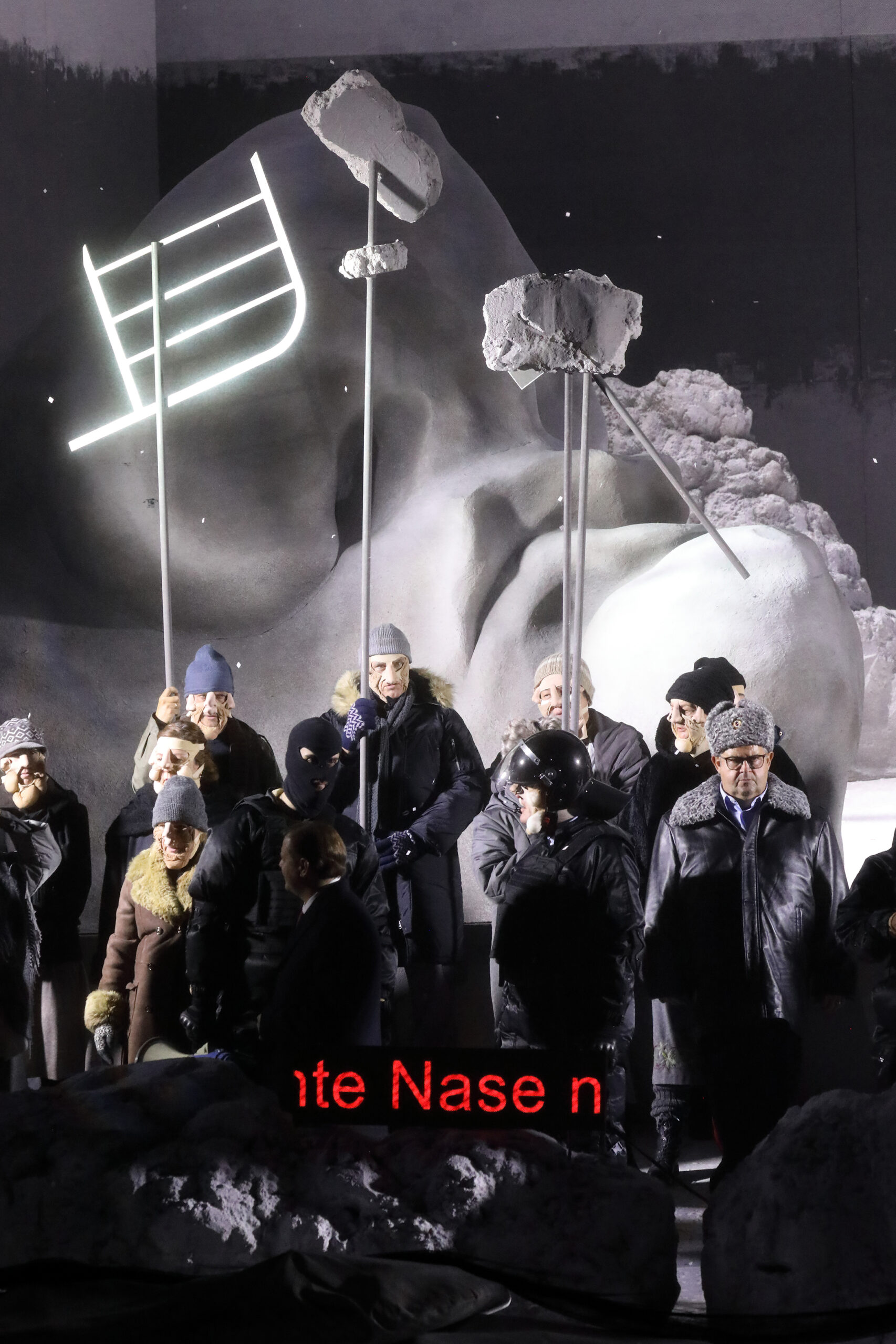 Au début de l'opéra, la police rase gratis, elle rase les nez de ceux qu'elle arrête : le nez est un marqueur de l'identité sociale ; chez Serebrennikov, ceux qui sont au sommet de la société en ont trois, quatre, dix : c'est dire le malheur du pauvre Kovaliov privé de tout appendice. Ce n'est pas une mauvaise idée, mais ce n'est pas non plus une révélation ; que la perte du nez signifie une perte de statut social, le livret ne dit pas autre chose, mais il ne fait pas de Kovaliov la victime d'un arbitraire : vaniteux, jouisseur, manipulateur, on dirait aujourd'hui (scène 16) harceleur de rue, ce qu'il subit est avant tout une blessure à son amour-propre, non le poids de la violence d'État.