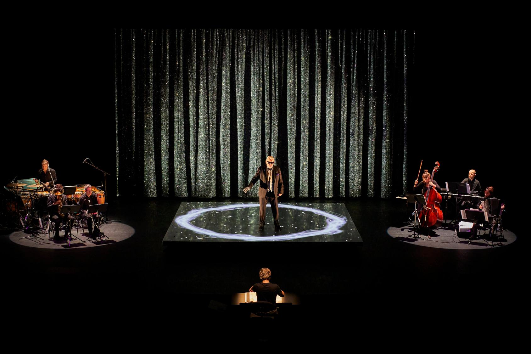Les moyens mis en œuvre sont des plus économes mais tout fonctionne à merveille au sein de ce dispositif où les instrumentistes sont sur scène, placés de part et d'autre d'un plateau surélevé qui bascule à mi- parcours, ouvrant des fenêtres où apparaissent les personnages. Un écran à la surface moirée habille le fond de scène. Il deviendra le rideau scintillant du « magic show », la scène du cabaret mutant sous les lumières de Rodolphe Martin et la vidéo de Loïs Drouglazet. En fin connaisseur du timbre et de ses capacités réactives, le compositeur Alexandros Markeas a choisi un ensemble atypique de six musiciens (ceux de l'ensemble TM+), clarinette, saxhorn et percussions à jardin, contrebasse, accordéon et clavier électrique à cour. Il signe une partition d'une vitalité extraordinaire où transparait le talent de l'improvisateur. La musique, dûment écrite et avec une précision d'orfèvre, impulse le mouvement scénique, apporte soutien rythmique et couleurs aux voix et insuffle cette part d'humour contenu dans le livret, du moins dans la première partie, la plus enlevée. Le texte, chanté le plus souvent, est aussi parlé-rythmé comme dans l'Histoire du soldat de Stravinsky : telle cette scène irrésistible où Sammy, en synesthète virtuose, fait son numéro devant les deux médecins, associant chaque nombre à un personnage dont les figures instrumentales fignolent le portrait. Musiciens et chanteurs sont placés sous la direction attentive autant qu'engagée de Laurent Cuniot, optant pour une position centrale mais à distance.