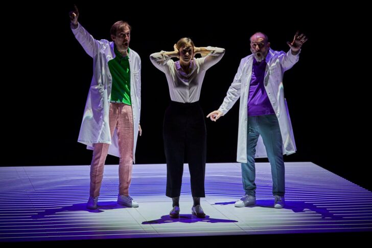 Bondissante et drôle, la soprano et comédienne Agathe Peyrat, alias Sammy Koskas, est clairement « phénoménale ». Passant très naturellement du parlé au chanté, la voix agile et fraiche se plie tout aussi aisément au profil fantasque de l'écriture vocale qui s'affranchit de la prosodie. Moins jeune mais toujours très convaincant, le baryton-basse Philippe Cantor endosse deux rôles : celui de l'employeur, aussi bourru qu'impressionné par les capacités de son salarié, et celui de l'agent artistique au gant scintillant dans la fameuse scène du « Magic show ». Quant aux deux médecins – inénarrables Vincent Bouchot et Paul-Alexandre Dubois -, ils sont tout à la fois burlesques (pantalon rose et chemise verte pour le premier) et effrayants (on pense à Wozzeck) lorsqu'ils sondent l'ampleur du don de leur patient dans le laboratoire de neuro-psychologie : effets comiques des répétitions et du parlé-rythmé relayé par les instruments (les multi-percussions très actives de Florent Jodelet ou encore le savoureux saxhorn de Vianney Desplantes) dans une très belle scène où Sammy les subjugue par le pouvoir de son imagination.