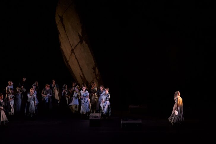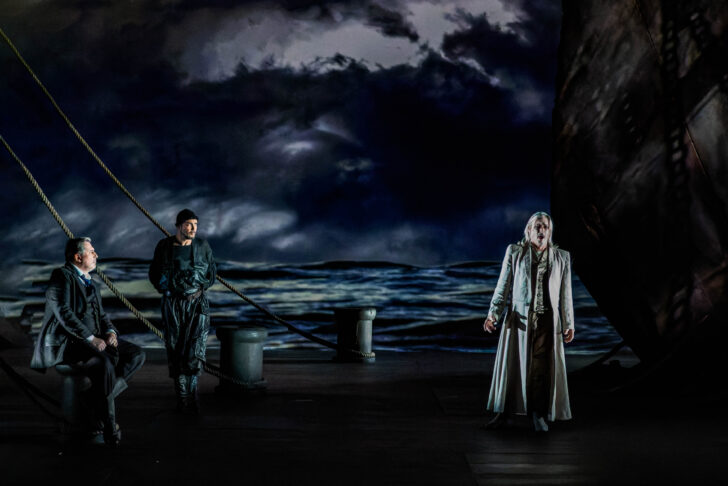 Créée à Orange en plein air en 2013 avec Mikko Franck puis reprise en théâtre à Marseille en 2015, la mise en scène de devait s'adapter à la scène des Chorégies et ne propose donc qu'un unique décor, fait d'une proue de bateau habillée par les vidéos, pour créer parfois un navire rouillé et parfois un rocher. Très simple, cette production apparaît cependant d'un aspect moderne et permet d'imager sereinement le livret, tout en apportant une belle scène de danse avant la tempête finale, là encore magnifiée par les chœurs. Auparavant, les tisseuses de l'acte II affichent la même qualité de préparation et laissent apparaître parmi elles la soprano dramatique française , qui retrouve enfin un rôle wagnérien après avoir dû annuler au dernier moment son Elisabeth/Vénus rouennaise l'an passé, pour cause de Covid-19.