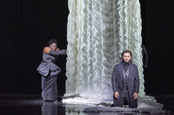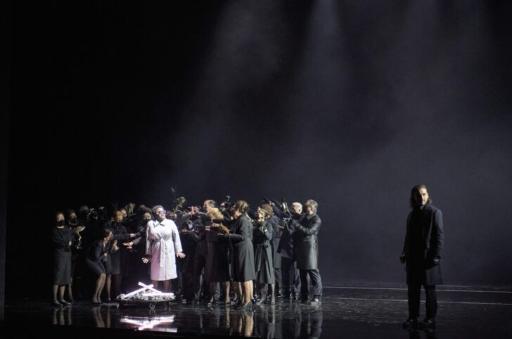 Si la mise en scène de Marco Štorman était suffisamment explicite pour suivre le déroulement de l'intrigue, on pourrait se passer du langage écorché des interprètes mais, là encore, rien à part la lecture des surtitres (en allemand !) ne permet de saisir le drame dans sa continuité. Gommé l'aspect visuel des faits sensés se dérouler après l'abdication de Charles-Quint, comme l'a fait l'Opéra de Liège au début de l'année dernière, en choisissant de faire évoluer les protagonistes à une époque contemporaine, le résultat est désolant de platitude. Des chanteurs errants, se traînant à terre, tournoyant sans raison, sur une scène noire et vide de décors à l'exception de voiles géométriques de couleurs descendants et remontants des cintres sans qu'on en devine le sens, des chœurs posés en rangs d'oignons, des personnages costumés qui de complet-veston, qui de leggins de cuir moulant, brossent le tableau d'une production jamais aboutie de cette œuvre majeure du répertoire lyrique romantique. Et comme il faut bien une signature personnelle, en irrespect de l'œuvre, Marco Štorman signe le tableau final montrant Éléonore abattant Don Carlos d'une balle dans le dos, la Princesse Eboli faisant de même de Philippe II alors que Thibault, imitant les autres, tue le Grand Inquisiteur !