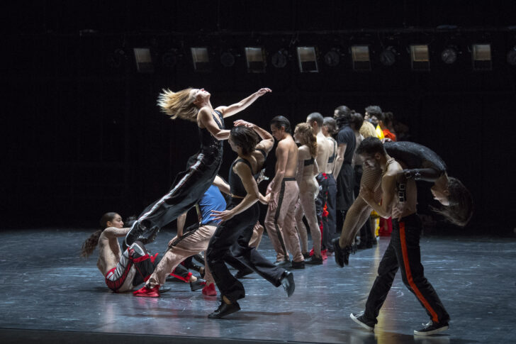 Même chorégraphe et même costumière, mais un projet totalement différent pour counting stars with you (musiques femmes), un hommage aux femmes compositrices, celles que l'histoire de la musique a quelque peu oublié. Un acte militant pour la chorégraphe qui explore régulièrement des courants musicaux ou des compositeurs méconnus. Cette deuxième partie de soirée s'appuie sur une partition s'inspirant des œuvres de très grands noms comme Barbara Strozzi ou Giovanna Marini, chantée par quatre danseuses et deux danseurs équipés de petits micros HF. Dans la production musicale, le vocodeur permet de faire le lien entre le chant des femmes d'Italie, Hildegarde de Bingen et les hip-hopeuses américaines. Les costumes en cuir seconde peau signé Koché, très années 80, sont aussi le signe d'un empowerment féminin. La danse s'efface au profit du remarquable travail polyphonique vocal des danseurs et il s'agit parfois plus d'une mise en scène vocale que d'une chorégraphie. La dernière partie, ultra tonique et rythmée, propose cependant une séquence de danse pure très physique sur des lumières stroboscopiques d'Éric Soyer, également créateur des lumières d'Angelin Preljocaj. Avant de laisser à nouveau la place aux rythmiques vocales qui transforment le spectacle en un concert de rock basé sur le cri, le halètement, la respiration. Ces danseurs-chanteurs nous offrent une performance bluffante et d'une grande modernité.