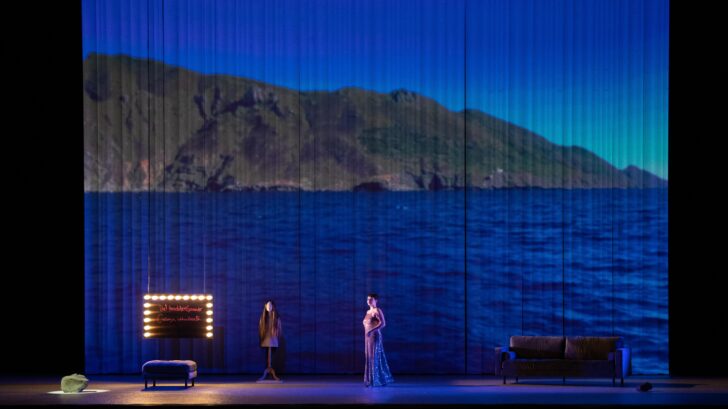 Mis en scène (une diva assoupie dans sa loge s'échappe en rêve sur une île mystérieuse avec ses questionnements intimes en miroir du spectacle dans lequel elle va jouer), scénographié (un quadrilatère sophistiqué de quatre rideaux à claire-voie montés sur rails qui, avançant et reculant, créent la forêt d'un espace mental en faisant également office d'écran géant), mis en lumières (un jeu d'orgues inventif en invité de luxe) et en vidéo (on s'envole dans les airs au dessus de l'Opéra de Dijon pour gagner les rivages inconnus de l'Île de Marettimo dans les Egades) par Luigi De Angelis (du collectif Fanny et Alexander), cette Isola disabitata est une très élégante carte de visite pour les quatre solistes issus de l'Académie de l'Opéra national de Paris.