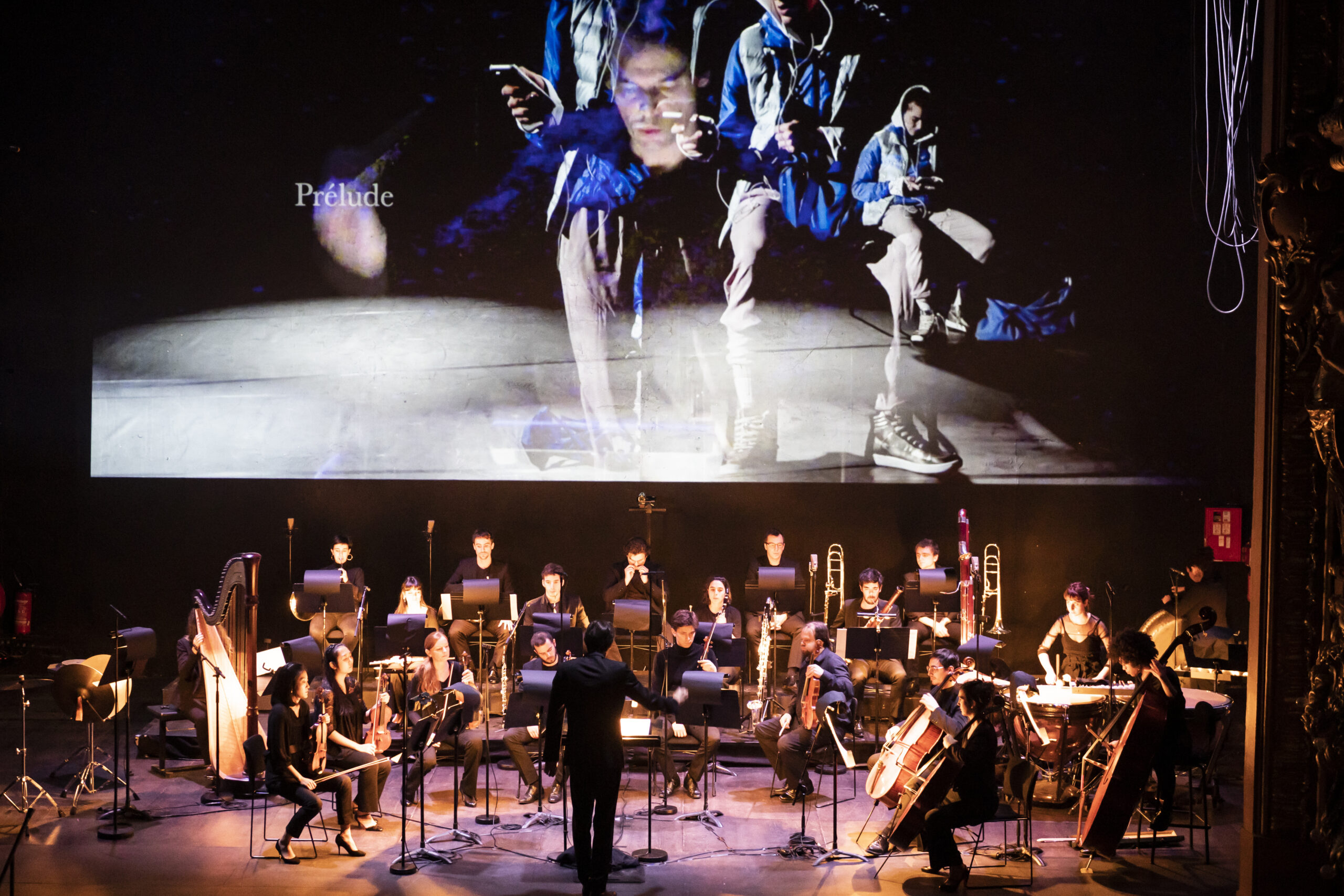 Le public s'installe dans la salle, tandis qu'à l'écran passent déjà des extraits d'une chorégraphie et qu'une bande électroacoustique sert de Prologue pour Salomé. Loïe utilise ensuite de courts thèmes, répétés et échangés entre les musiciens, comme pour créer une danse à l'intérieur même de la musique. D'une dizaine de minutes, l'œuvre moderne introduite par la flûte met en avant la concentration de l'ensemble Les Apaches, parfaitement maintenue par le directeur musical, Julien Masmondet. Ensuite, la formation à deux instruments par groupe pour les cordes jusqu'aux violoncelles et une seule contrebasse nécessite de toujours bien maintenir les équilibres dans la partition de Schmitt, où les bois et surtout la harpe ressortent parfois plus, sans que cela ne soit véritablement gênant pour cette partition sous l'influence de Debussy dès l'introduction, et plus encore au 5e tableau, pour la partie marine.