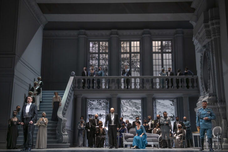 La mise en scène d'Emilio Sagi, très classique voire statique, transpose l'action dans l'immédiat après Grande Guerre et campe en un seul décor – un vaste hall d'un palais vénitien d'allure néo-classique, grisâtre et glacé dans sa monumentalité – le lieu de l'action, subtilement éclairé par Eduardo Bravo au fil des actes (le jour, la nuit, et enfin le petit matin). Heureusement, cette représentation ne tient pas de la seule et simple mise en un imposant espace par l'implication scénique et l'engagement théâtral de tous les protagonistes, chœurs compris.