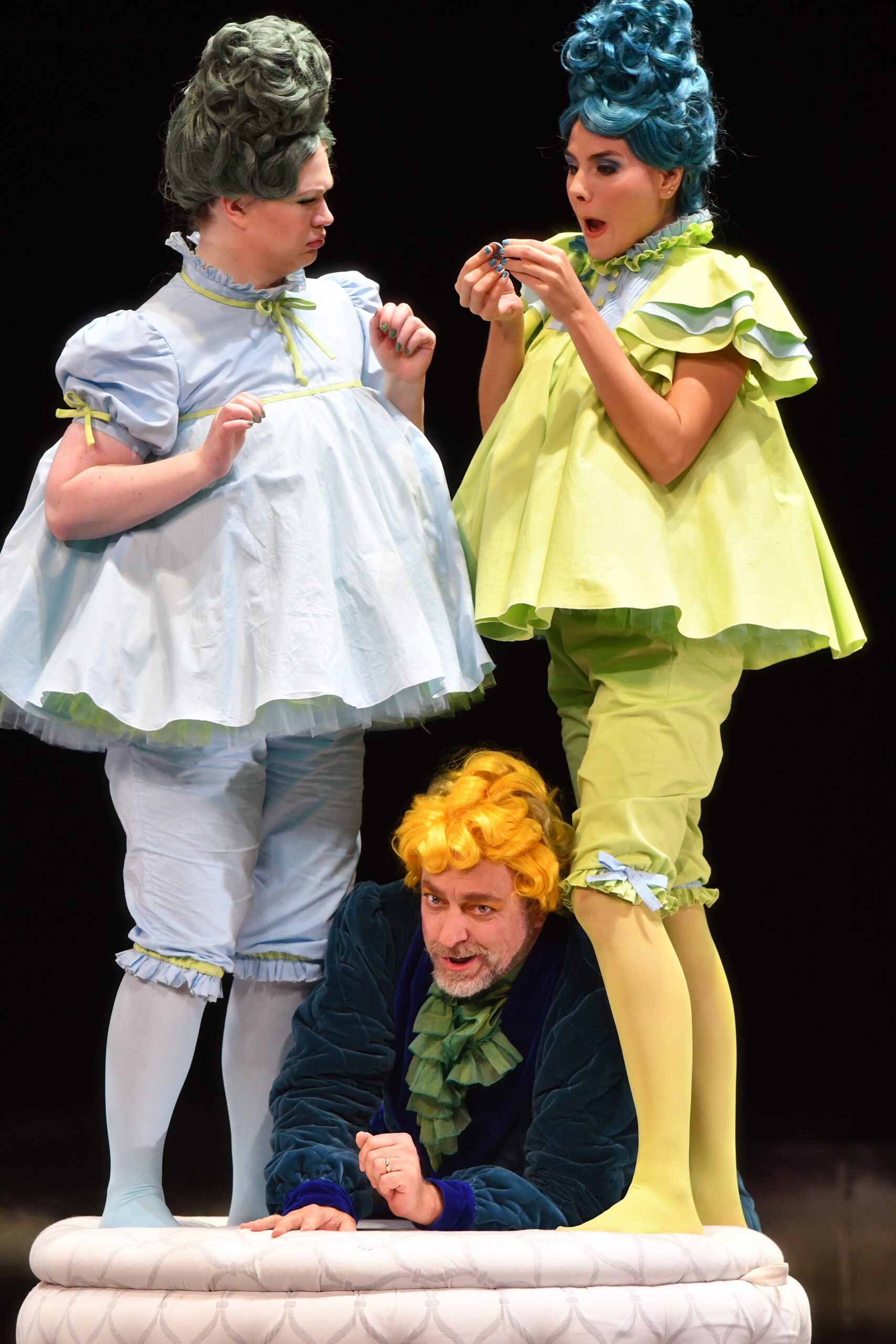 Pas du tout intimidée par les presque trois heures d'horloge du vingtième opéra de Rossini, décide de se passer de décor ! En ciel de scène, un immense lustre aux couleurs changeantes et aux bougies sensibles aux différents lieux de l'action, capable de se transformer en cage dorée, comme de tanguer sous l'orage, palpite au rythme des affects. Au sol, montés sur roulettes, un trio de canapés, un pouf à malices sur lequel l'héroïne aime à se prélasser. La diagonale d'un long tapis rouge déroulé. Quelques nénuphars. Un arbre. Un flamant rose… Une explosion dorée de cotillons pailletés qui en met plein la vue. Une longue pluie de plumes au ralenti sur le spectaculaire Finale de l'Acte I. Le carrosse est une simple…. poursuite ! Avec ce trois fois rien balayé par un jeu d'orgues classieux, dessine un univers esthétique affirmé qui donne un vrai blanc-seing à la couleur. Le Prince flamboie sous une perruque rouge. Celle d'Alidoro surplombe un costume (vert !) décidé à faire fi de tous les tabous théâtraux. Le chœur, masculin dans Cenerentola (comme dans celui du Teatro Valle où, en 1817, Rossini créa son opéra en s'adaptant à l'effectif choral qui ne comptait que… des hommes) affirme sa féminité (et sa vocalité malgré la présence de masques visuellement très bien intégrés) au moyen d'élégants carrés de perruques roses pour tous. Les demi-sœurs de Cendrillon sont particulièrement servies, leur robes hilarantes leur donnant l'allure finalement assez monstrueuse de fillettes mal poussées. Toutes silhouettes découpées sur un fond noir et dédoublées par un sol en miroir : c'est constamment beau à voir.