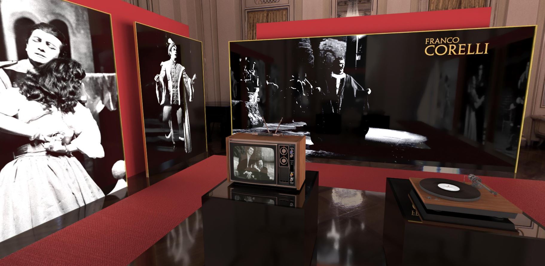 Trois espaces bien définis s'explorent ensuite dans le foyer du Théâtre, chacun consacré à l'un des héros de la scène lyrique italienne et selon une construction identique : un panneau « totem » représentant le chanteur de pied et auquel est associée une vidéo de présentation de l'artiste menée par le guide-conférencier alimentée par des documents, des photographies, des iconographies et d'autres archives du Musée du Théâtre ; des murs amovibles rouge où sont accrochées sept grandes affiches interactives pour sept grands rôles – en cliquant dessus, la performance de l'artiste s'active avec extrait audio et album photos – ; et au centre de l'espace, se trouve une caméra en bois pour Caruso et une télévision pour Di Stefano et Corelli où est associée pour chaque artiste un extrait vidéo de l'une de leur prestation phare. Enfin, un gramophone pour le premier et une platine vinyle pour les deux autres, complètent ce dispositif afin d'entendre une playlist disponible dans sa version complète sur les trois principales plateformes musicales à condition de disposer déjà d'un compte personnel. Il est appréciable de facilement se promener de salle en salle, quitte à revenir sur ses pas, grâce aux flèches au sol de la visite virtuelle, ou bien par le biais d'un menu de navigation parfaitement clair.