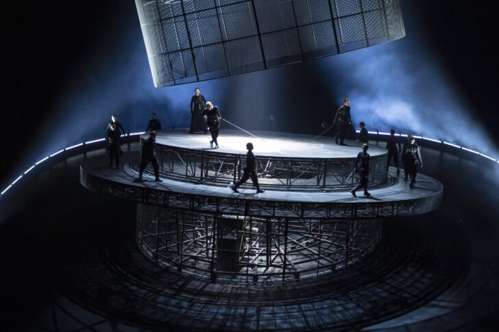 « Tous sont pris au piège ! », résume Ulrich Rasche dans le parti pris de sa mise en scène. De fait, personne n'est en paix. Elektra s'impatiente de ce qu'elle soit vengée, sa sœur Chrysothemis veut échapper à cet enfer, la mère Klytämnestra ressent la haine de sa fille comme le remord de son acte. Prisonniers de leur espace, constamment dans l'agitation de l'esprit, les plateaux tournant sans discontinuer, les acteurs de cette vengeance n'ont d'autres possibilités que de tourner en rond dans une chorégraphie superbement obsédante (Jonathan Heck, Yannik Stöbener, Justus Pfankuch). Leurs jambes continuellement en mouvements, le haut du corps immobile, la tête haute, les bras ballants, ils n'ont que leur chant à offrir. Hormis ces marches incessantes, ces reculades, ces avancées, ces pas de côtés, aucun geste des bras ne se fera avant que la vengeance ne soit accomplie. Alors, dans une ultime scène, comme un cri du cœur, de l'âme, Elektra, du haut de sa tour, lèvera les bras au ciel pendant que défileront ses servantes vaincues, la tête baissée.