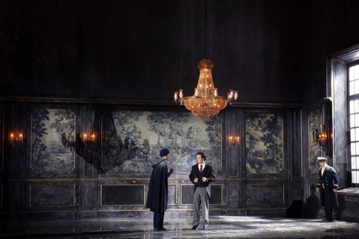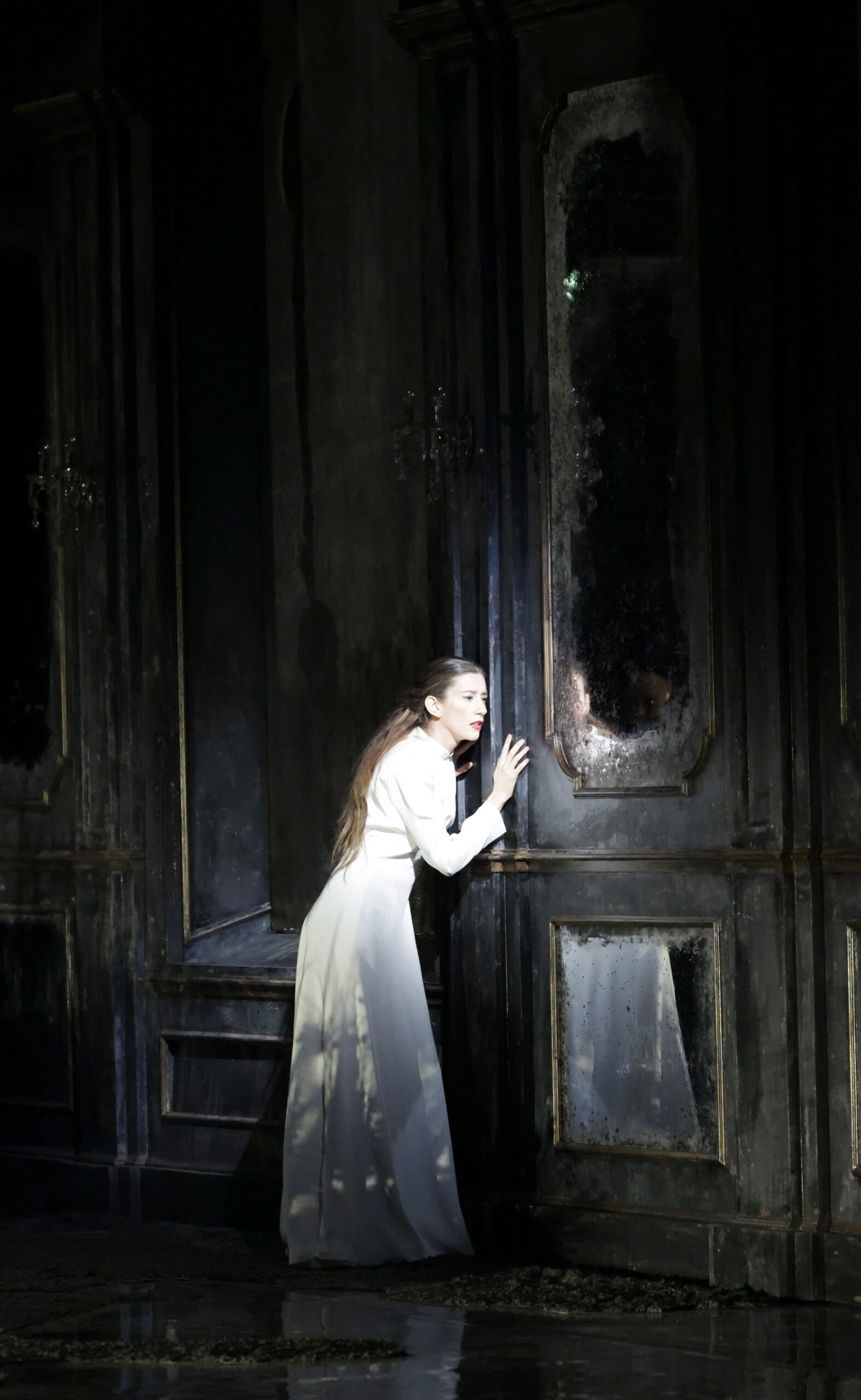 Une trame qui inspire à Nicola Berloffa une mise en scène que l'on qualifiera d'intelligemment classique, mais tout aussi prenante, par exemple, que celle de Bruno Ravella pour Werther. Son immense décor mobiliste, ses costumes discrètement modernistes, et surtout ses lumières transformistes offrent de grands motifs de satisfaction. On visite les intérieurs étouffants d'un Elseneur marmoréen mué sporadiquement en catafalque par de noires tentures coulissantes, et progressivement envahi par une végétation qui n'avait eu jusque là droit de cité que dans des vidéos de transition glanées autour du palais : chemins forestiers, branches dépouillées, ruisseaux charriant des reliefs floraux et même une bien funeste coulée sanglante. Quelques raideurs en terme de direction d'acteurs (la pantomime expressionniste du poignard brandi comme dans un film muet dans le dos du monologue de Claudius, la prosaïque sortie d'Ophélie après une « mort » parfaitement réglée, même si en-deçà, esthétiquement parlant, de la sublime photo hivernale du projet de mise en scène proposé par Ravella dans le programme de salle) n'oblitèrent pas la réussite d'une narration sans temps mort. Le jeu d'orgue de Valerio Tiberi crée avec maestria des moments de pur effroi : la scène du Spectre sous les fumigènes et la neige, le duo Hamlet/Gertrude…