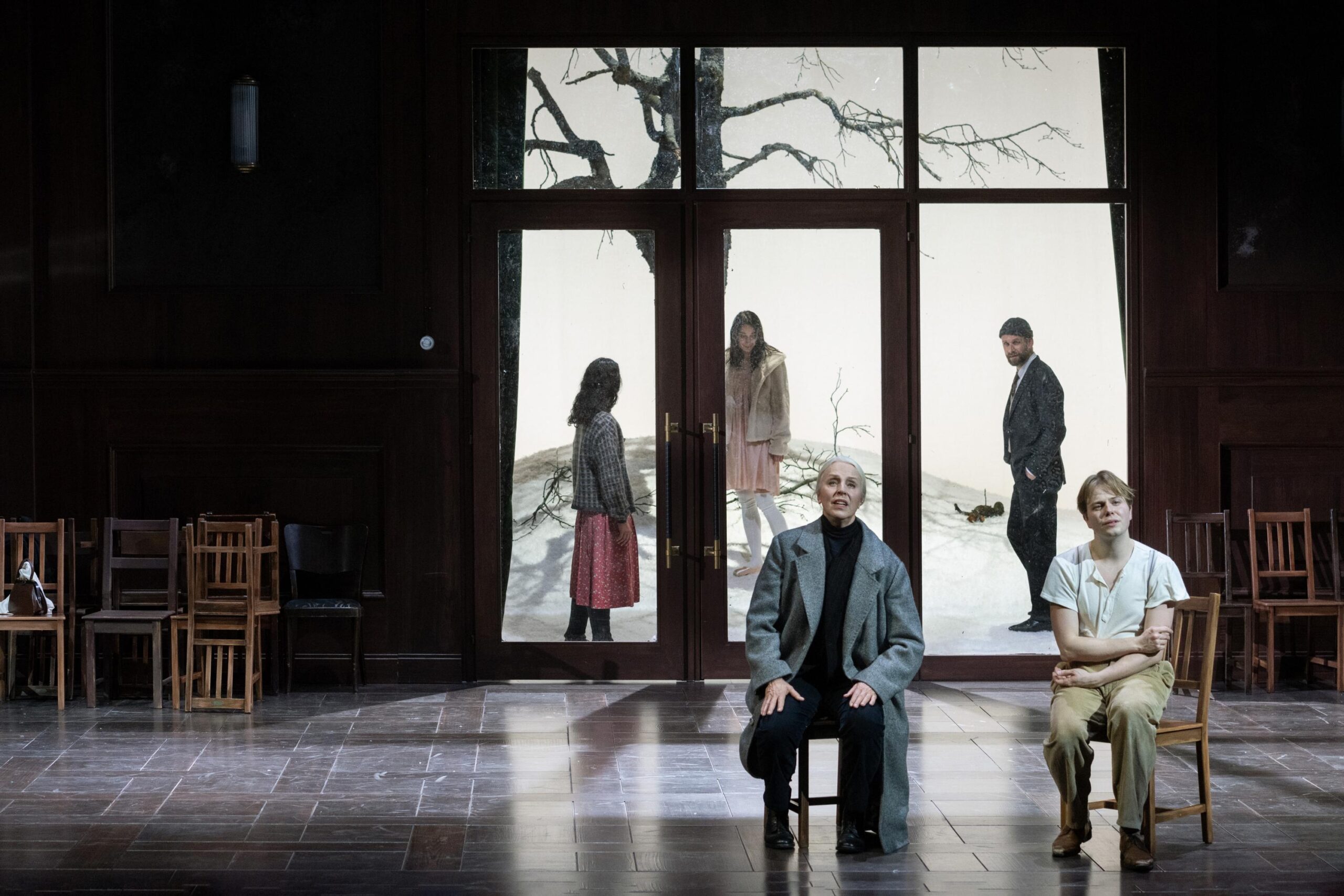 Le spectacle conçu par Christof Loy snobe les surtitres, et demande beaucoup à son spectateur. Préférant de toute évidence diriger le regard sur l'humain, le geste toujours millimétré du metteur en scène captive même quand il se laisse aller à quelques effets trop vus ailleurs (les chaises que l'on renverse !). Les clairs-obscurs de Roland Edrich veillent sur ce psychodrame à trois. La lumière, née de l'obscurité, la regagne à la fin après qu'en une shakespearienne pirouette invitant le spectateur à conclure par lui-même ce récital de vingt-quatre pièces, la cantatrice a malicieusement tourné l'interrupteur. Juste avant, le hall éblouissant de l'arrière-plan du décor a fait place à la blancheur immaculée d'un paysage d'hiver planté d'un arbre décharné arraché à une toile de Caspar David Friedrich, tandis que quelques flocons ont même chuté par la verrière aux carreaux manquants, sur le parquet de la salle de bal.
