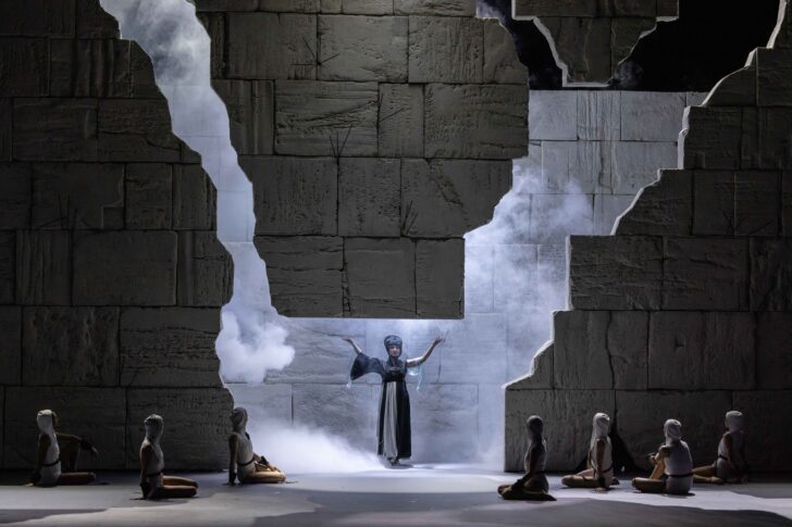 Sur le plateau, la distribution vocale est d'un excellent niveau. Certes, le chant baroque français impose un style déclamatoire très particulier. Sorte de parlé-chanté (à moins que ce soit le contraire !), l'entendre pendant près de trois heures lasse l'auditeur peu habitué à cette expression vocale. Reste que chacun se plie avec talent à cet impératif vocal. La voix blanche du ténor rôle-titre Mattew Newlin (Atys) convient idéalement au personnage faussement indifférent qu'il incarne avec beaucoup de présence. A ses côtés, la soprano Ana Quintans (Sangaride) est tout aussi contenue quoique plus colorée vocalement que son compère. Plus typée vocalement cependant, la mezzo-soprano Giuseppina Bridelli (Cybèle) impose un personnage de caractère et d'autorité céleste remarquable. Son entrée sur scène, le mur de pierres monumentales s'ouvrant lentement laissant apparaître cette invitée envoyée des dieux, est une image d'une beauté extrême. Parmi les autres rôles, on ne peut passer sous silence le baryton-basse Michael Mofidian (Idas/Phobétor/Un songe funeste) dont la voix profonde chargée d'harmoniques, timbrée à souhait, parfaitement conduite, la diction impeccable rappelle, dans un tout autre registre, l'admirable Samuel Ramey dont les murs de l'institution lyrique genevoise vibrent encore d'un souvenir vivace. Des autres chanteurs, tous par ailleurs très bons, on retiendra la voix charmante de la soprano Lore Binon (Mélisse) et la puissance vocale doublée de l'excellence de la prononciation du baryton-basse Andreas Wolf (Célénus). Le Chœur du Grand Théâtre de Genève est, comme à son habitude très en forme, malgré deux légers décalages d'avec l'orchestre.