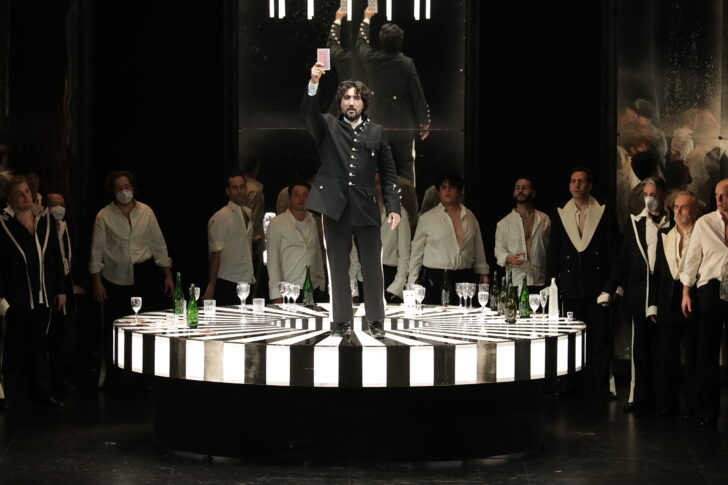 Le livret de La Dame de Pique inspiré de la nouvelle fantastique éponyme de Pouchkine nous conte le destin tragique d'un jeune soldat, Hermann, à la recherche d'une martingale de trois cartes susceptible de lui apporter la fortune tant espérée : une quête hallucinée et obsessionnelle dans laquelle il perdra l'amour, la raison et la vie. Tout un parcours chaotique et psychologiquement « border-line » entrelaçant délire et addiction, amour et cupidité, que Matthias Hartmann décline d'une manière très lisible en quatre tableaux : un espace noir abstrait où se dressent quatre blocs volumineux et oppressants, éclairés par des néons aveuglants qui figurent métaphoriquement le poids du destin pesant sur les personnages ; une salle de bal style XVIIIᵉ siècle, comme un flash-back, avec costumes en rapport ; une chambre cossue, celle de la Comtesse ; une salle de jeu dans un mess d'officiers où s'achèvera le drame. Les beaux costumes de Malte Lübben., les éclairages de Mathias Märker et les décors de Volker Hintermeier participent de cette lecture pertinente, respectueuse du livret, avec des moments très réussis théâtralement comme le suicide de Lisa dans la Neva ou l'apparition fantomatique de la Comtesse venue confier à Hermann le secret de la martingale tant désirée. La direction d'acteur est efficace, seule la chorégraphie un peu longuette et d'un goût incertain de Paul Blackman apporte une légère ombre au tableau au mitan de l'acte II.