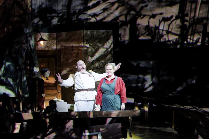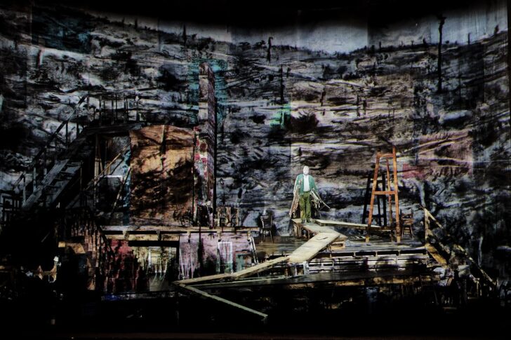Dessinateur, sculpteur, graveur, cinéaste, homme de théâtre et metteur en scène, l'artiste polyvalent William Kentridge aime, dans son travail, lier entre elles toutes ces formes d'expression. Il déploie sur la scène de Bastille un décor aussi profus qu'ingénieux qui lui permet de modifier les perspectives du plateau sans jamais interrompre le mouvement scénique. Rappelons que dans l'opéra de Berg, dont le compositeur écrit lui-même le livret d'après les fragments du Woyzeck de Georg Büchner, les quinze scènes réparties en trois actes – Exposition, Péripétie, Catastrophe – s'enchaînent de manière continue, dans une exigence de concentration (une heure trente cinq de musique seulement) et de tension dramatique exacerbée. Si les éléments de scénographie – celle de Sabine Theunissen – qui ménagent pour les personnages différents niveaux d'apparition, constituent le décor unique de l'opéra, Kentridge – avec son co-metteur en scène Luc De Wit – en remodèle sans cesse les contours de manière saisissante. Des projections, textures colorées et autres films d'animation puisent leur imagerie « dans le grand roman de la Première Guerre mondiale » dont Berg avait fait l'expérience éprouvante, rappelle le metteur en scène, avant de commencer son opéra en 1918 : un avion de guerre qui s'échoue sur le sol, des figures monstrueuses avec masques à gaz (d'une douloureuse actualité), des dessins animés grotesques et grinçants à la manière d'Egon Schiele, pour dénoncer la violence d'une société dominante broyant le destin des « pauvres gens » mais aussi la violence du désespoir qui pousse Wozzeck à tuer Marie.