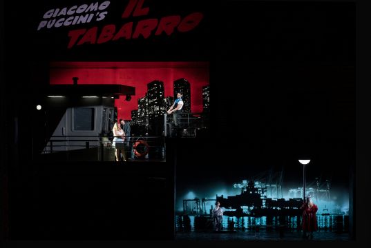 Il Tabarro – annoncé scéniquement par une enseigne lumineuse façon cinéma des golden sixties – voit son espace compartimenté, tel un comics américain en « lignes sombres », réparti entre quatre espaces : pont de la péniche, soute, chambre de Giorgietta et quai parisien, le tout placé sous l'ombre menaçante d'immenses tours HLM. En lucarne, en haut à droite, est posté un écran de télévision, seul divertissement possible pour les pauvres bateliers – où l'on devine la retransmission décalée d'une pièce de théâtre désopilante.