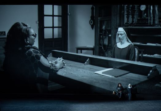 Dans Suor Angelica, avec le décor spartiate réduit à un mur (de couvent mais aussi de projection cinématographique type drive-in), l'usage quasi continu de la vidéo en noir et blanc (filmée en l'abbaye de la Cambre) permet entre autres de dédoubler (en live et en vision off) l'affrontement de la Zia principessa avec sa nièce Suor Angelica, et surtout de meubler le drame, par les non-dits du livret et par l'évocation de la vie quotidienne des carmélites. Kratzer explore ainsi aussi par le truchement des séquences vidéos les envies intimes des sœurs : par exemple Sœur Dolcina se goinfre de friandises à s'en rendre malade, Soeur Genovieffa lit en cachette, avec une coreligionnaire, un story board (dont la couverture rouge est seule touche colorée dans un camaïeu de gris) – un manga narrant le ….Giacomo Puccini ‘s Tabarro : le livre jeté au feu dans les derniers instants du drame par la Mère Supérieure scandalisée par cette découverte, entraîne par l'éparpillement des tisons l'embrasement général de toute l'institution religieuse, en un incendie rédempteur où, entre flammes et volutes, apparaît le fils tant aimé et décédé d'Angelica.