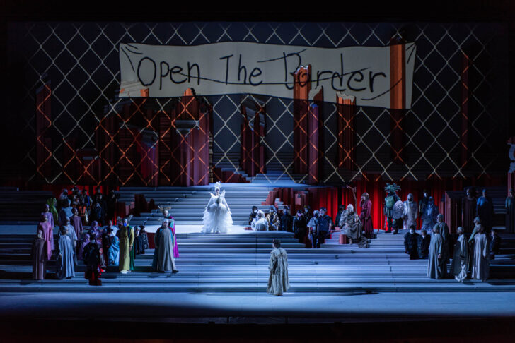 L'artiste iconoclaste Ai Weiwei signe à Rome, ville qu'il adore et qu'il considère comme « sa ville », sa première et unique (selon ses dires) mise en scène d'opéra. Une réalisation complète avec décors, costumes et vidéos. Il opte pour une scène classique en apparence, mais comme pour mieux la déformer du début à la fin avec une impressionnante série de vidéos, d'images enregistrées et de séquences animées qui défilent en arrière-plan comme un film asynchrone par rapport à l'action du drame, prenant le public au piège, captant son attention jusqu'à ce qu'il soit hypnotisé par une histoire dans une histoire. La scène est unique, fixe et immuable, avec l'escalier asymétrique du palais de l'empereur, sur lequel sont assis, presque immobiles, comme des figurants dans un tableau néoclassique, des gardes, des mandarins, des grands prêtres et des dignitaires de la cour, dans leurs somptueux vêtements aux couleurs vives qui changent de ton et d'intensité selon les gradations des lumières de Peter Van Praet. Autour d'eux se trouvent les soldats et les foules mouvantes des habitants de Pékin, ainsi qu'une procession d'enfants. En arrière-plan défilent des images tridimensionnelles des vidéos d'Ai Weiwei, tournées une première fois il y a deux ans pour la production annulée pour cause de Covid, et filmées à nouveau en 2022, une réalisation qui coïncide avec la fin des restrictions sanitaires et le début de la guerre en Ukraine.