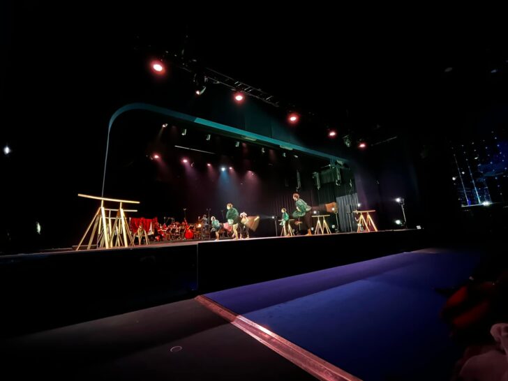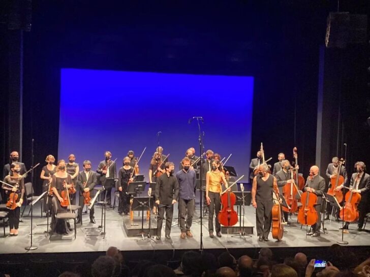 Six tréteaux de bois recouverts de grands châles colorés (ils finiront sur le dos des danseurs) cernent l'espace des sept danseurs de la Compagnie lyonnaise Hallet Eghayan (deux garçons et cinq filles en costumes noirs et pieds nus) tandis que l'Ensemble Orchestral Contemporain en grande forme (douze instrumentistes) dirigé par Léo Margue est en fond de scène, amplifié comme il se doit. Six solos, superbement dansés par les membres de la compagnie, sont dédiés à chacun des anges de la création et alternent avec cinq intermèdes (« Temps qui passe ») souvent très courts évoquant les univers culturels rattachés au monde yézidi (hébraïque, arménien, arabe, perse) : autant de séquences musicales réparties équitablement entre les deux compositeurs et d'incitations sonores renouvelant les timbres selon l'imaginaire des musiciens : tel ce long solo de flûte alto (Aram Hovhannisyan) pour l'ange Nouraïl qui se donne à voir simultanément ou cette clarinette basse associée au marimba (Michel Petrossian) pour l'Ange Chemnaïl (ils ont tous des noms hébreux). Citons encore le solo de l'ange Istrafil (cor, harpe et alto) où le corps contraint du danseur (muré dans un cercle) modifie radicalement le geste chorégraphique. L'ange Dardaïl (Michel Petrossian) convoque le violoncelle solo chantant un hymne yézidi, sorte de psalmodie responsoriale très hypnotique rejointe par les mouvements de la danseuse.