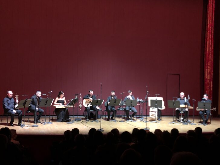 Le Gurdjieff Ensemble, neuf musiciens jouant des instruments traditionnels d'Arménie et du Moyen-Orient, a investi le devant de la scène de l'Opéra Garnier pour nous convier à un voyage dans le temps, de la musique arménienne médiévale du XIIᵉ siècle aux compositeurs du XXᵉ siècle. Au programme ce soir, la figure tutélaire de Komitas et des arrangements « ethnographiquement authentiques » de la musique de Georges Gurjieff (1866 ou 1972-1949), un compositeur dont la pensée ésotérique influencera bon nombre d'artistes et de penseurs français parmi lesquels figure Pierre Schaeffer. En vedette au centre du demi-cercle, les deux joueurs de duduk, cette anche double au son velouté très sollicitée dans les pièces au programme. Mais c'est la zurna, hautbois puissant d'origine anatolienne, sur les coups abrupts du tambour, qui débute le concert comme elle va le refermer. C'est la seule manifestation bruyante d'une soirée où l'on se laisse davantage envoûter par la belle voix de Vladimir Papikyan aux inflexions savantes et raffinées et le son émouvant de la flûte oblique dont le timbre coloré de souffle est entendu plusieurs fois en solo. Citons encore le jeu racé du kanon (cithare arménienne), de la kamancha (vièle à quatre cordes) et du tar évoquant la mandoline. Levon Eskenian, directeur artistique et arrangeur, vient diriger les chants sacrés de Gurdjieff faisant intervenir les instruments du rituel, sonnailles et bol de l'Asie. Car les influences sont nombreuses, entre Moyen-Orient, musique grecque, persane, chants du Caucase, etc.