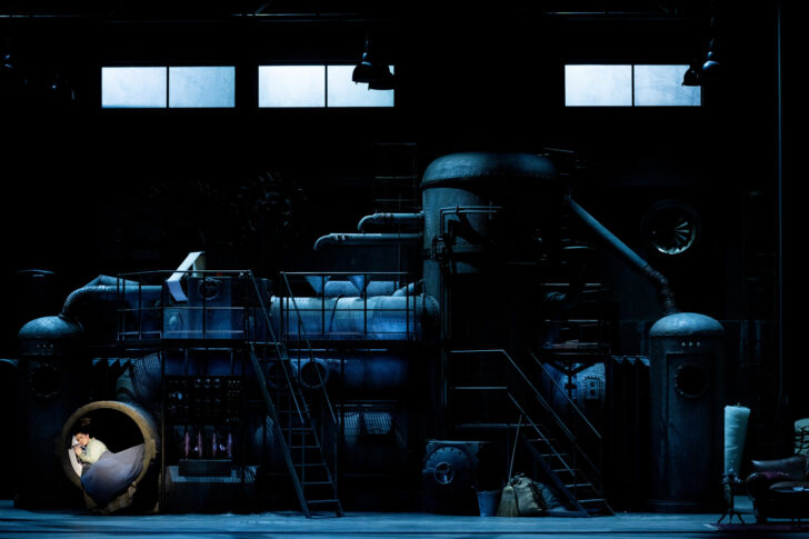 L'Acte III est le plus intrigant : Cendrillon, persuadée qu'elle a rêvé, se perd dans la Forêt des Fées. L'occasion est propice. La metteuse en scène embarque le spectateur dans un rêve éveillé qui fait se soulever le plateau tout entier (une des potentialités trop rarement sollicitée de l'Opéra). Apparaît alors, dans les sous-sol de la fabrique, une étrange forêt, non pas de fées, mais de fûts. Rouillés et mouvants, ces containers abritent d'énigmatiques contenus, dont le cœur (géant) du prince cité dans le livret : image bien saignante, que le premier degré de la mise en scène fait palpiter sous nos yeux, d'une scène aussi disruptive que celle du livret, très émancipée du conte de Perrault.