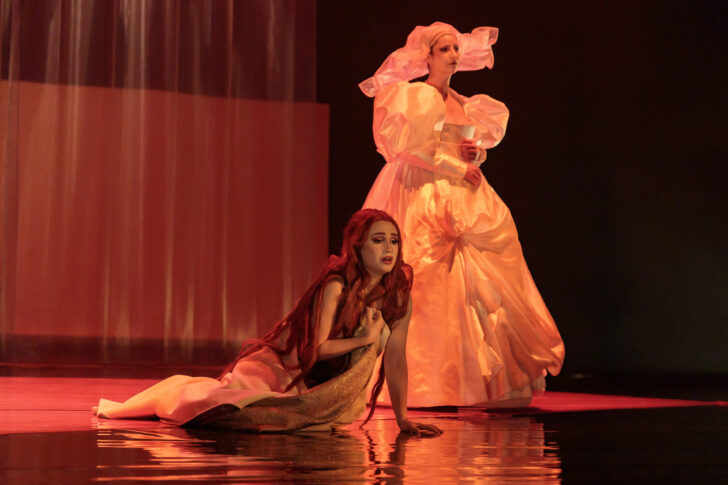 La Sonnambula de Bellini n'est certes pas l'opéra le plus facile à monter de nos jours. Son intrigue désuète, son manque de théâtralité, la fadeur et la naïveté de ses personnages ont de quoi rebuter les metteurs en scène qui chercheraient à donner un semblant de vérité ou de vraisemblance à une action particulièrement marquée par la convention. À ceux qui ne sauraient se satisfaire du kitsch de bon aloi qui consisterait à maintenir l'histoire dans son décor de Suisse de carte postale, reste l'option – plutôt fructueuse pour cet opéra – de la lecture psychanalytique, voire celle du second degré méta-théâtral, à l'image de ce qu'on a pu voir dans la mise en scène du Met de New York. La proposition faite par Francesca Lattuada est un peu un mélange de ces deux possibilités. Acceptant les conventions théâtrales inhérentes aux ouvrages dits de bel canto, elle assume pleinement les hasards des entrées et des sorties de scène, et elle renonce pour cette intrigue villageoise à tout ancrage temporel et géographique. L'action semble se dérouler dans un espace onirique et surnaturel marqué par une stylisation extrême des décors et des costumes, que soulignent encore les interventions de la contorsionniste Lise Pauton. L'intrigue pourrait être vue comme un rêve, ou un voyage intérieur d'Amina, laquelle verrait dans le personnage de sa rivale Lisa un double inversé et négatif d'elle-même, et dans celui du comte Rodolfo une vision paternelle et hypersexuée de l'amant idéal. L'interprétation fait sens, les images ne manquent ni d'allure ni de beauté, en partie grâce aux décors minimalistes et aux éclairages irréels de Christian Dubet, ainsi qu'aux extraordinaires costumes de Bruno Fatalot : habits d'homme pour des femmes du chœur et vice-versa ; robe rouge écarlate à traîne de dragon pour Lisa, juste pendant de la simple broderie blanche d'Amina ; pantalon rose-bonbon, ailes d'ange, cuirasse d'or et braguette métallique pour Rodolfo, autant d'attributs qui contrastent avec le costume classique d'Elvino. Cette lecture mentale et onirique, qui s'offre au public tel un songe éveillé, n'est en rien contraire à la simplicité d'une musique convenue sur le plan harmonique, mais dont on redécouvre à chaque détour les chatoyantes couleurs instrumentales, pour ne rien dire de tant de mélodies ensorcelantes.
