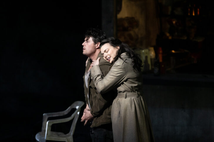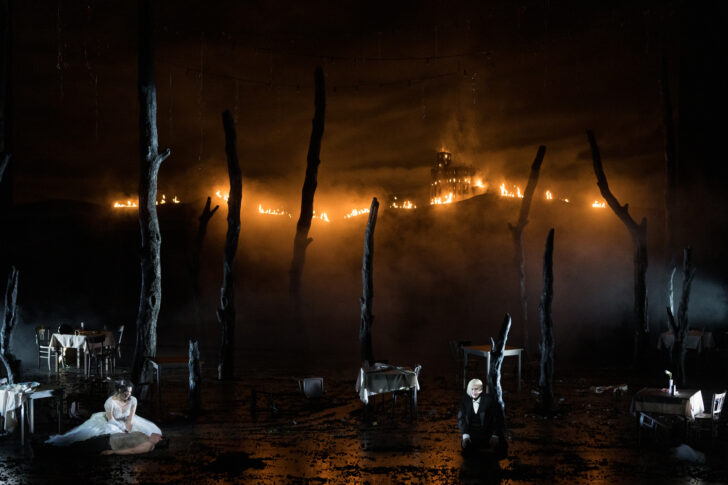 Irrelohe (du nom d'une petite gare où Schreker avait fait halte) raconte la fin d'une malédiction, celle condamnant à une mort prématurée chacun des membres d'une lignée de seigneurs-violeurs. Dernier rameau des branches de ce désolant arbre généalogique, Heinrich découvre à la fin d'Irrelohe que le viol de l'aubergiste Lola par son propre père, avait donné naissance à Peter. Heinrich et Peter sont donc demi-frères : deuxième secret de famille, après celui de Rigoletto, du festival 2021-2022. Un secret révélé par Christobald, ex-amant délaissé de Lola, et bien décidé à se venger. Plutôt que la fin heureuse prévue par Schreker (mettre un terme à la malédiction), la production lyonnaise opte pour la déflagration pour tous (mettre le feu) : Peter meurt sous les coups d'Heinrich qui, comme dans Le Trouvère, ne sait pas qu'il vient d'occire son demi-frère ; Eva, dévastée entre les deux garçons qu'elle aimait, décide de se suicider ; Heinrich n'a plus qu'à contempler dans le lointain, enflammé par Christobald et ses sbires, le château maudit qui toisait de sa noire silhouette la campagne d'Irrelohe où, depuis des générations, les seigneurs avaient coutume de traquer leurs proies.