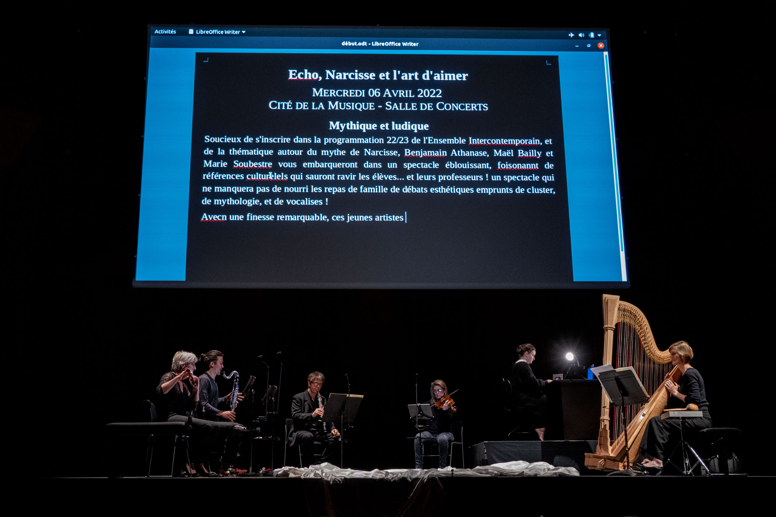 La commande est de l'Ensemble Intercontemporain et cinq de ses musiciens sont sur scène pour la nouvelle création de Maël Bailly, une opérette moderne aux influences multiples autour du mythe d'Écho et Narcisse. D'un peu plus d'une heure, l'œuvre peine à trouver un rythme dans son découpage en trois parties, surtout à même de faire rire le public par les textes, imprimés en arrière-scène et au début du spectacle tapés d'un clavier par la soprano Marie Soubestre, afin que le bruit sonorisé s'allie à celui des instruments.