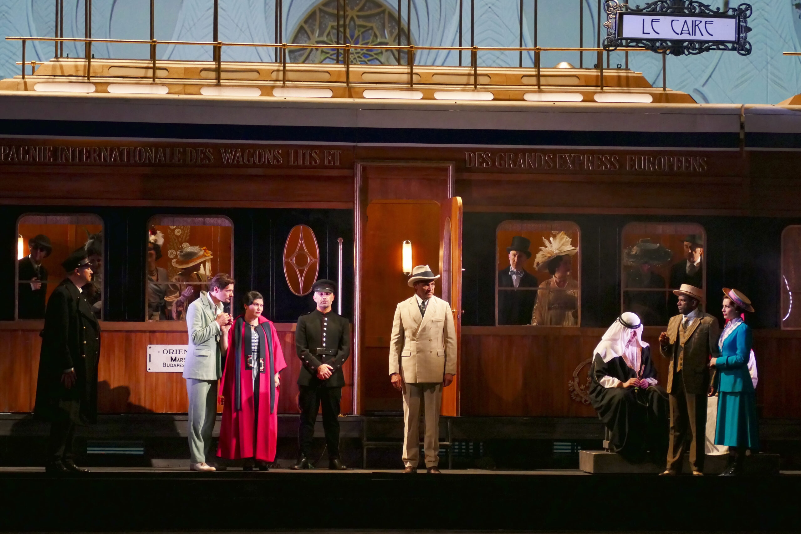 Moyennant quelques mini-entorses aux surtitres, Kaegi convie le petit monde mozartien dans le fantasme d'un Orient-Express inédit entre Marseille et Le Caire, avec escales à Salzbourg (Mozartkugeln obligent), Budapest et Istanbul. Encore convalescent d'un récent Cosi fan tutte confiné dans une unique salle de musée, inquiet que toute l'action soit condamnée entre le marchepied et le quai, voire dans un couloir exigu de wagon de 1ère classe, on n'est pas loin de tirer la sonnette d'alarme. Mais dès que le train s'ébranle, la production, costumée avec un luxe qui ressuscite le meilleur du dernier cri des Années folles, s'affiche très vite de première classe : non seulement elle parvient à créer l'illusion d'un vrai voyage (bruitage ferroviaire, fumée de locomotive, rais de lumière, défilement de panneaux indicateurs, travellings de paysages en arrière-plan et même personnage à quai glissant de cour à jardin), mais nous fait pénétrer, par effet de zooms avant, dans toutes les lieux du train (cabine de luxe de Selim, wagon-bar tenu par le barman Pedrillo, wagon-restaurant, cuisine), l'évasion finale se faisant par le toit ! Le tout est esthétiquement fignolé par un cadre de scène et par un surlignage art déco de l'omniprésente vidéo touristique de Gabriel Grinda qui fait défiler, à différentes vitesses, des incontournables (La Bonne Mère, Sainte-Sophie, Khéops, Kephren, Mykerinos…) mais également tout un arsenal de paysages propices aux états d'âmes, dont une nuit étoilée au moment suspendu du climax amoureux . Au coeur de Martern aller Arten, le wagon pivote spectaculairement à 90° afin de permettre à Constance, harcelée par Selim, de se réfugier sur le balcon arrière de la rame, tandis que, très symboliquement, le train file à toute allure dans un long tunnel qui aurait ravi Hitchcook! Après cet impressionnant moment, une ellipse temporelle permet au voyage, continué sur une carte ferroviaire dessinée pendant l'entracte sur le tulle d'avant-scène, de se conclure au Caire, ce qui est une façon astucieuse de revenir au livret originel. Quant au The End final, qui fait le focus sur Selim, il finit de cerner l'ambiguïté de l'insaisissable Constance, et d'offrir un touchant écho au destin intime de Mozart dont on sait qu'il mit dans cette intrigue, dont le légèreté n'est peut-être qu'apparente, beaucoup de sa vie. Au terminus, on réalise combien nos craintes sur le quai de départ étaient infondées tant il s'en sera passé de belles dans ce train nommé Désir dont les cabines auront ouvert leur porte à plus d'une configuration amoureuse…
