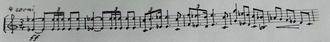 Le premier mouvement s’ouvre sur la sirène tonitruante des cors claironnant l’avancée du destin – à l’instar des « Trompettes de Jéricho » ou l’appel au « Jugement Dernier ». Mais le ton s’adoucit sous peu pour faire place à une ligne ondoyante à l’unisson des cordes qui nous emmène au fin fond des plaines russes. Les accords syncopés, tamponnés en sourdine, soulignent l’effet de pulsation peu à peu accélérée, avant que s’élève une danse en notes pointées et sautillantes dans les bois, soutenue par une valse délicieuse aux violoncelles. Plus loin, dans l’accélération, Tchaïkovsky favorise la cellule rythmique que voici, répétée à l’infini .
