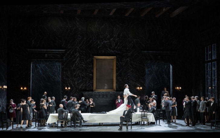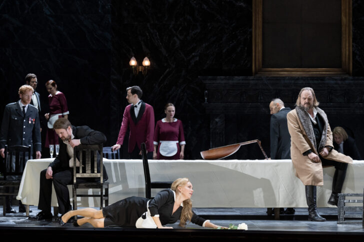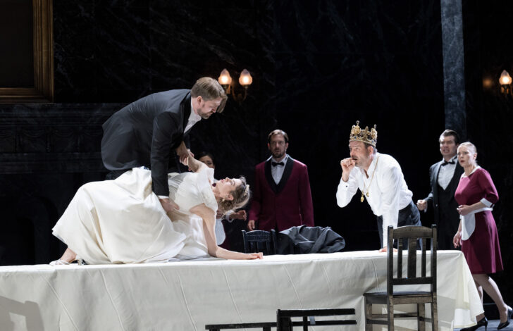 Berlin. Deutsche Oper Berlin. 01-V-2022. Franz Schreker (1878-1934) : Der Schatzgräber, opera en un prélude, 4 actes et un épilogue sur un livret du compositeur. Mise en scène : Christof Loy. Décors : Johannes Leiacker. Costumes : Barbara Drosihn. Lumières : Olaf Winter. Dramaturgie : Dorothea Hartmann. Avec : Tuomas Pursio, Le Roi ; Doke Pauwels, La Reine ; Clemens Bieber, Le Chancelier ; Michael Adams, Un Comte ; Joel Allison, Le Médecin/Le Maire ; Michael Laurenz, Le Bouffon ; Thomas Johannes Mayer, Le Bailli ; Seth Carico, Gentilhomme ; Gideon Poppe, Le Scribe ; Daniel Johansson, Elis ; Stephen Bronk, Aubergiste ; Elisabet Strid, Els ; Patrick Cook, Albi ; Tyler Zimmerman, Soldat ; Michael Gernot Sumper, Manuel Mairhofer, David Martinez Morente, Stefan Liebermann, Hanno Jusek, Nicolas Franciscus, KorayTuna, Niall Joseph Fallon, Benjamin Werth, Jeanna Serikbayeva, Sonja IsabelReuter, Xenia Wolfgramm, Acteurs & Actrices. Chor der Deutschen Oper Berlin (Chef de Choeur : Jeremy Bines). Orchester der Deutschen Oper Berlin, direction : Marc Albrecht