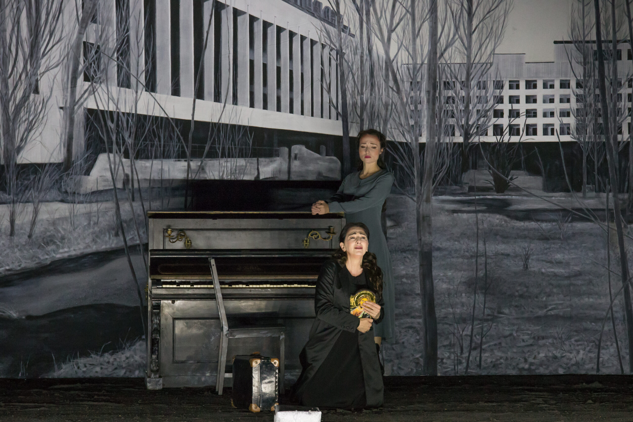 Un rêve dans lequel, privé de note d'intention, l'on navigue à vrai dire un bon moment à vue : qu'est-ce que ce palais de cendre aux vitres soufflées par une déflagration inexpliquée ? Qu'est-ce que ce noir théâtre d'ombre pour le grand chef-d'oeuvre, avec Eugène Onéguine, du grand compositeur russe ? Le décor de Pierre-André Weitz se décline sur deux étages : un rez-de-chaussée abritant un lit de fer et un piano usé ; un premier étage muni d'une scène cadrée par des baies coulissant sur le mouvement perpétuel d'orageux ciels contraires, et sur lequel tombent quelques clichés d'immeubles à la contemporanéité questionnante : mais où sommes-nous donc ? La terrible vérité apparaîtra après l'entracte, au quatrième tableau (moment le plus attendu de l'opéra), celui de la chambre de la Comtesse. L'échange tendu entre la « Vénus moscovite » et le troisième homme venu pour lui extorquer le secret mortel des trois cartes a lieu devant un nouveau cliché tombé des cintres. Le curseur temporel est cette fois sans appel : cette salle de classe dévastée… le 26 avril 1986… la première déflagration nucléaire reçue par l'humanité !